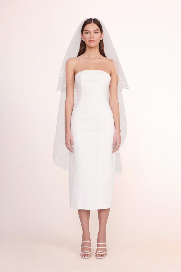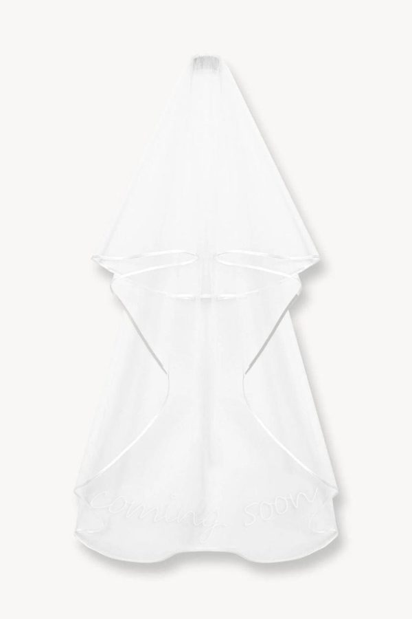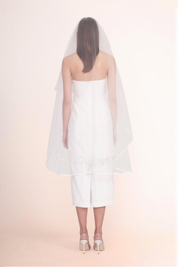 An elegant mid-length tulle veil featuring a delicate blusher, finished with sophisticated satin trim and romantic “coming soon” embroidery along the back hem. This beautiful veil is securely attached to a comfortable hair comb for easy wear throughout your special day.