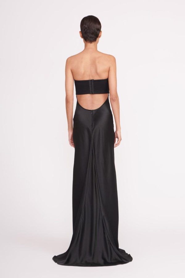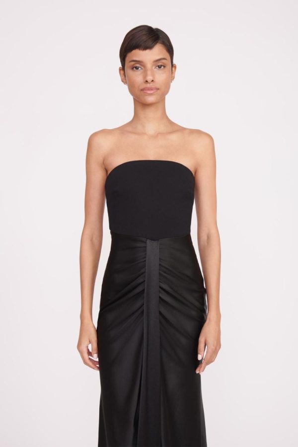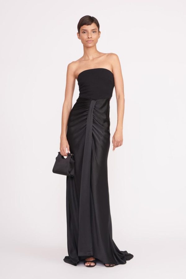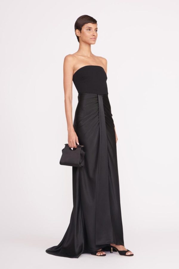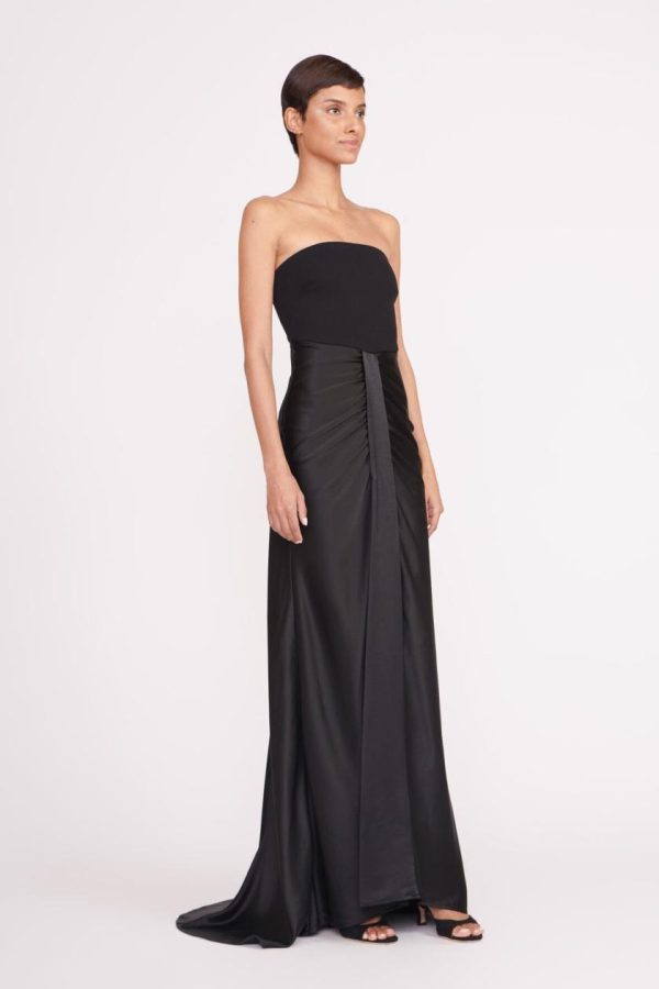 The Wayfaring Dress offers timeless sophistication with its elegant ponte bodice and beautifully ruched satin skirt. This strapless evening gown features a bra-friendly bodice design and a stunning open lower back for a captivating silhouette.