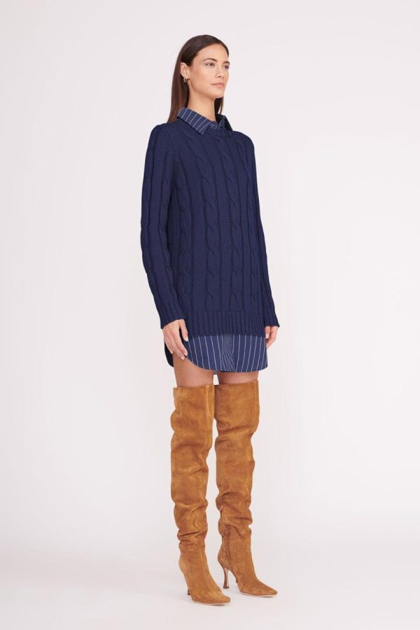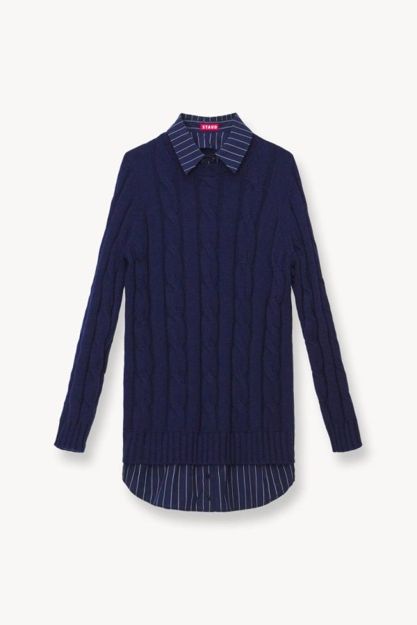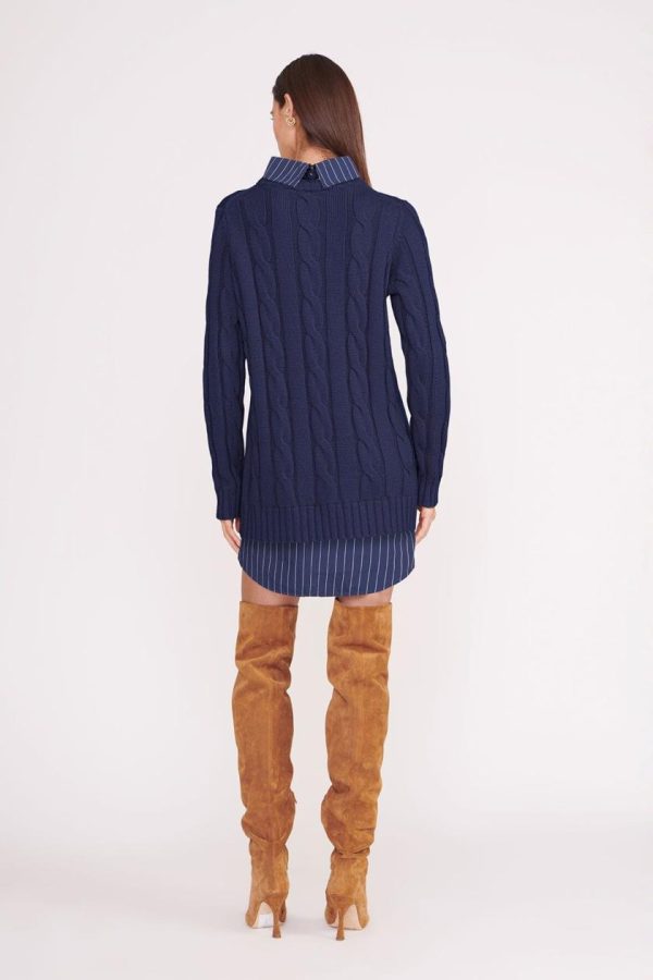 Your new go-to one-piece solution. This sophisticated long sleeve sweater dress hits just above the knee for a flattering silhouette. The Aldrin dress features beautiful cable knit construction with a crisp poplin collar and shirt tail hem that creates the illusion of a layered outfit without the bulk.