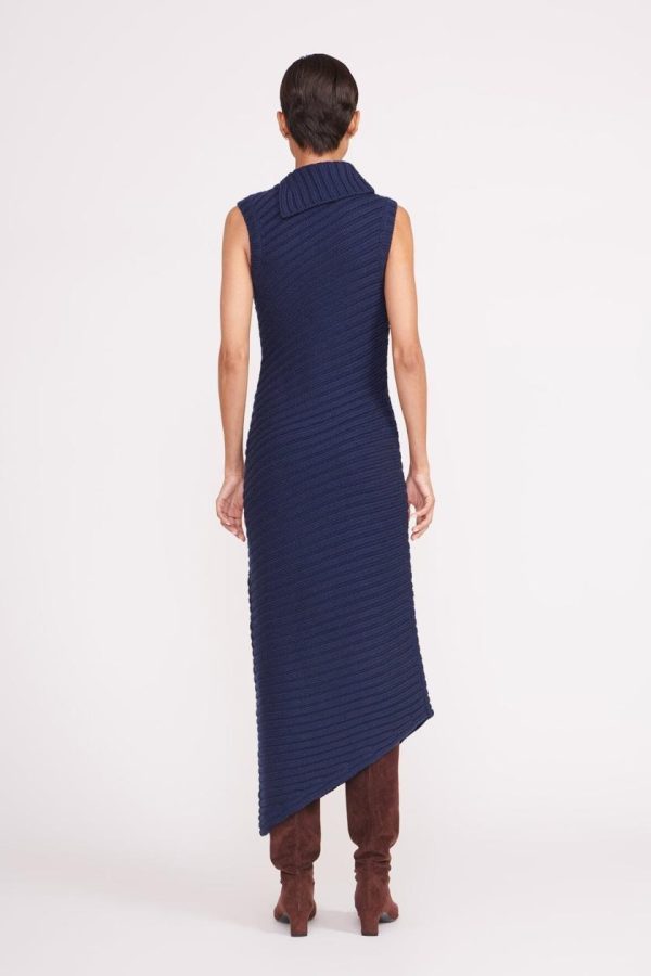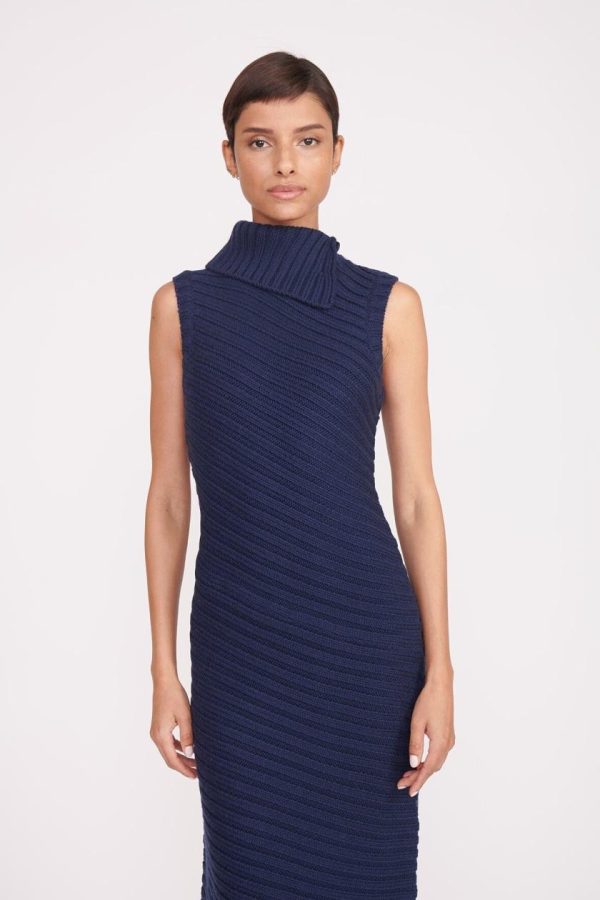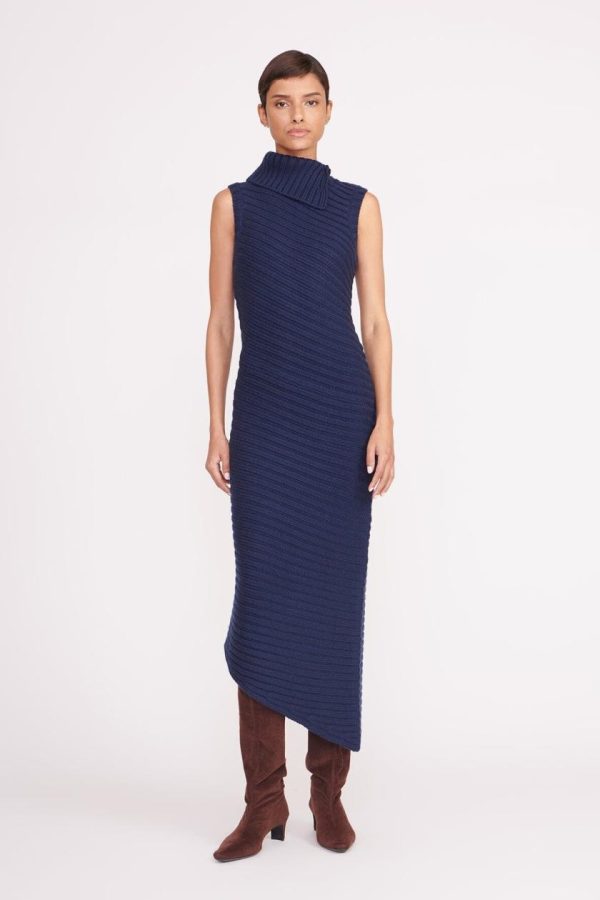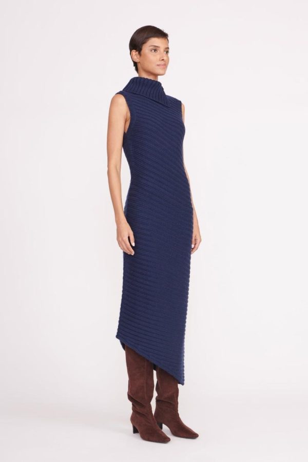 Discover the Cary Dress, a beautifully crafted chunky knit midi dress featuring striking asymmetrical design elements. This sophisticated sweater dress showcases elegant diagonal rib stitching and a contemporary asymmetrical turtleneck collar and hemline for a modern, fashion-forward look.