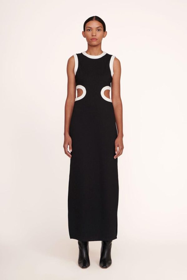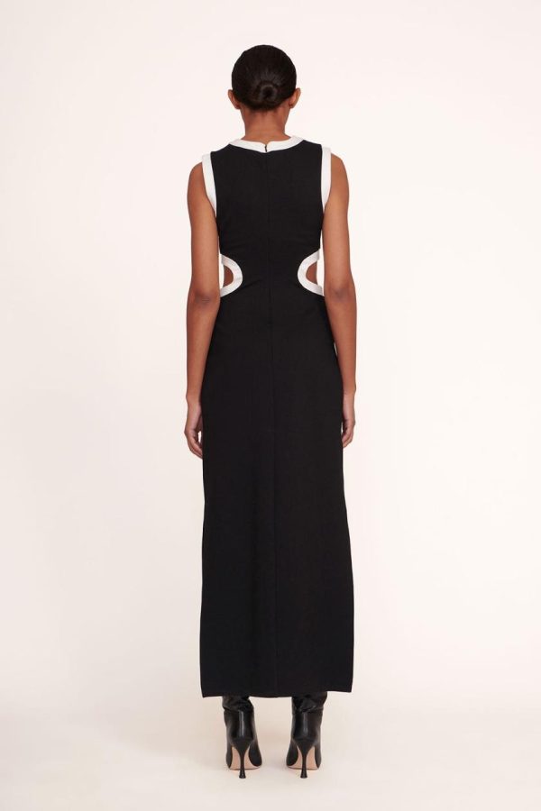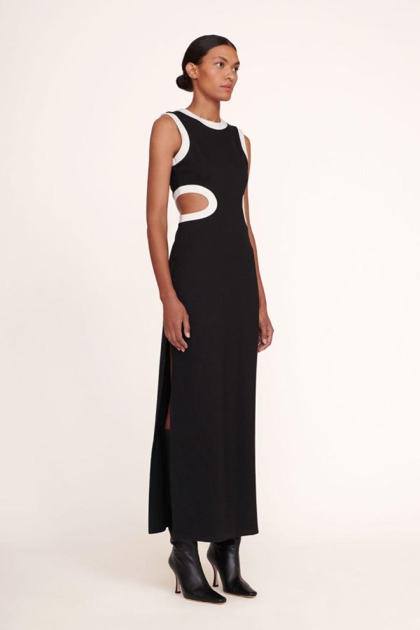 Elevate your evening wardrobe with the sophisticated Dolce Dress, featuring a sleek full-length silhouette and sleeveless design crafted from premium ponte fabric. This stunning piece showcases fashion-forward cutouts at the waist, elegant side slits for movement, and a streamlined back zipper closure with contrasting trim details that create a striking visual appeal.
