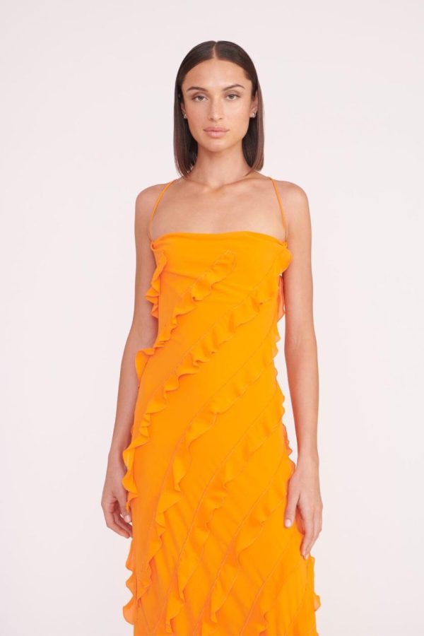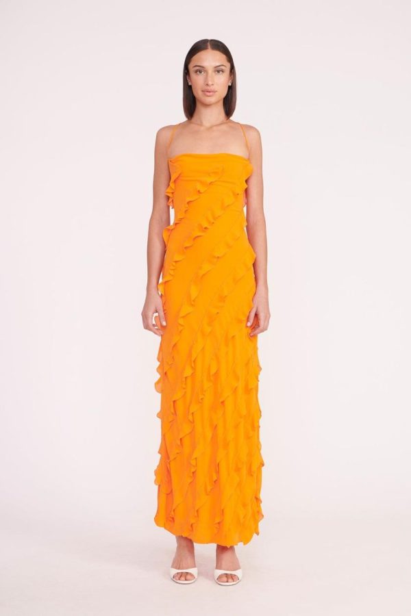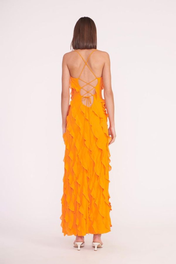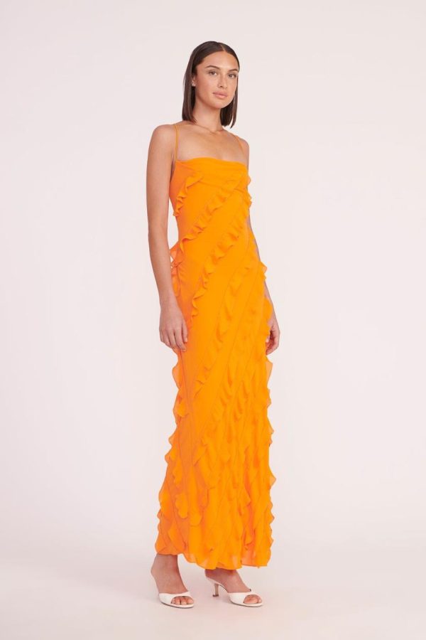 Elevate your occasion wardrobe with this stunning maxi slip dress featuring a beautifully fitted bodice, elegant horizontal ruffles, and a chic strappy neckline that creates a flattering silhouette.