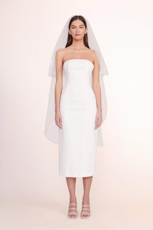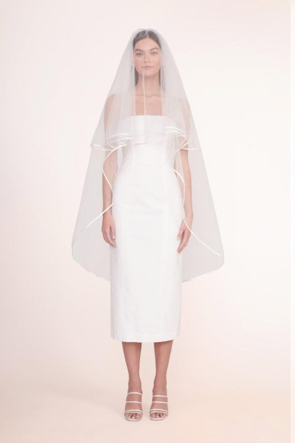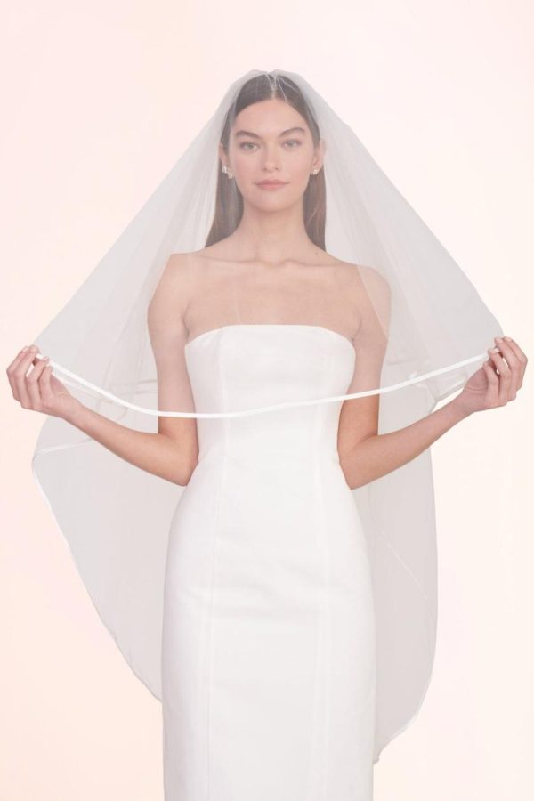 An elegant mid-length tulle veil featuring a delicate blusher, finished with sophisticated satin trim that showcases “game over” embroidery along the back hem. This beautifully crafted veil secures effortlessly with a convenient hair comb attachment.
