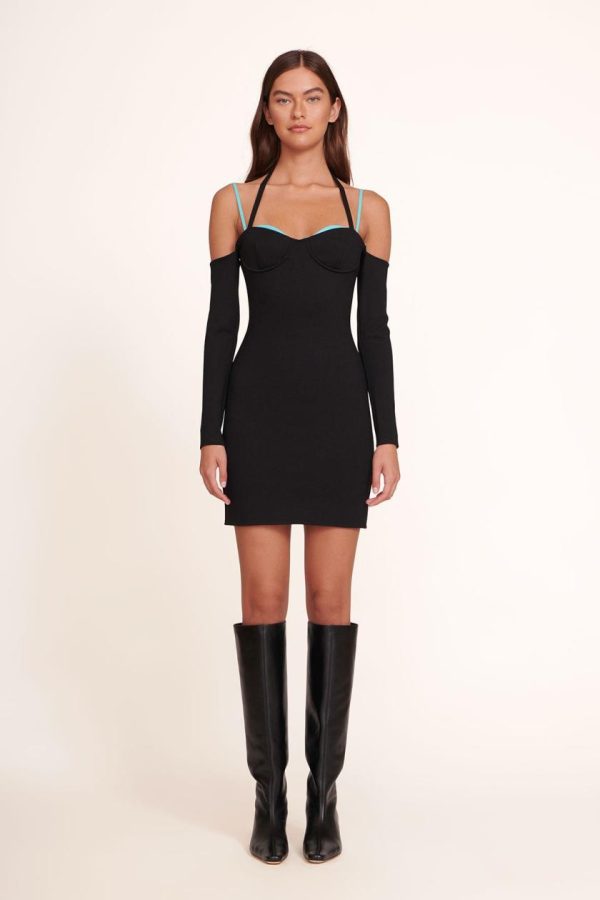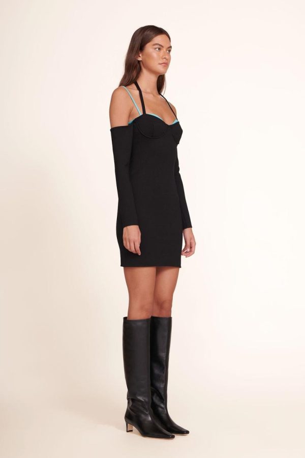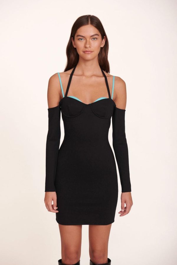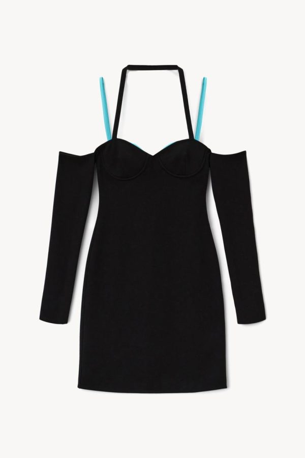 The Graphite Dress features a flattering sweetheart neckline and chic off-the-shoulder sleeves that create an elegant silhouette. This stunning mini dress includes a peekaboo contrast bra and open back design for a sophisticated yet daring look.