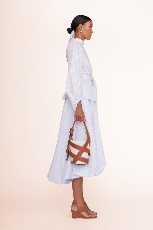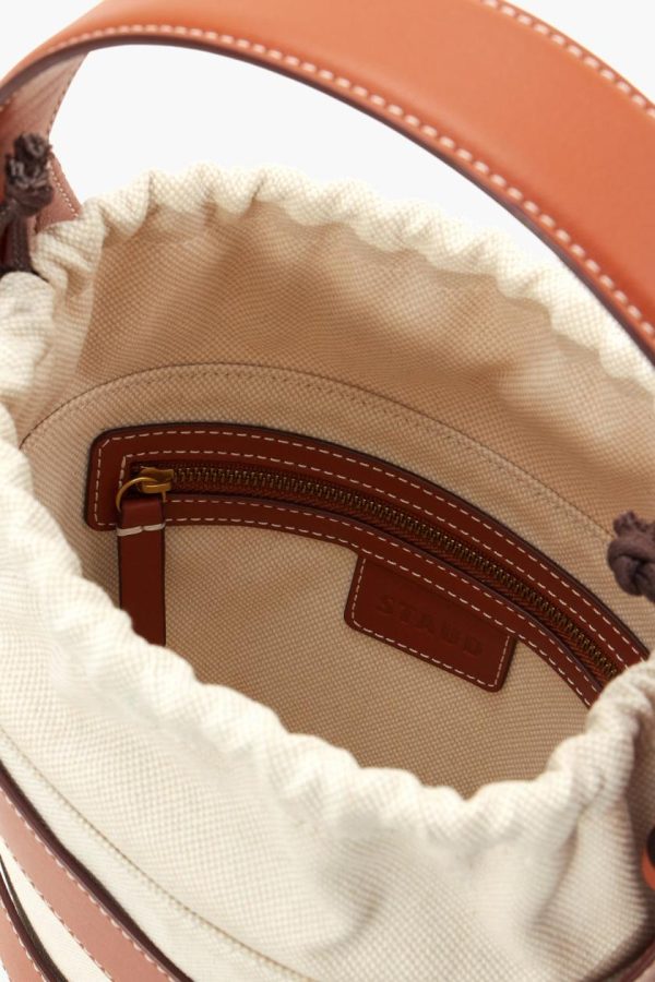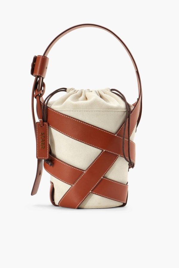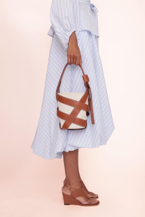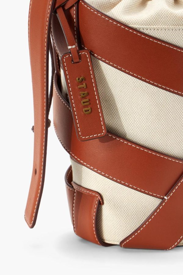 Discover the beautifully structured canvas bag featuring an artfully interwoven leather strap basket design. The versatile Hive Bucket Bag offers flexible carrying options as either a handheld or shoulder bag
