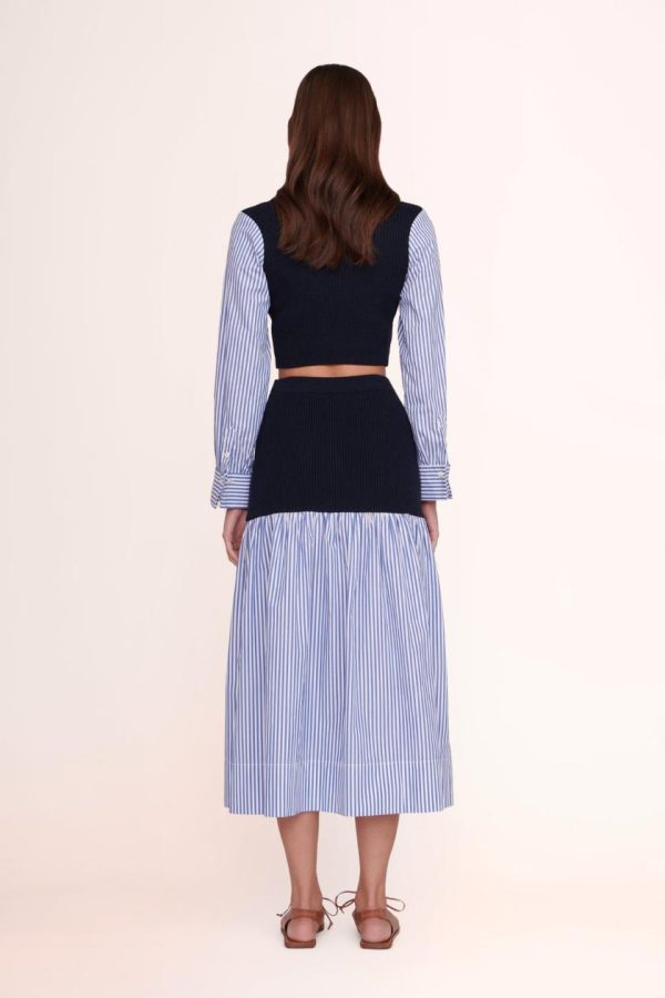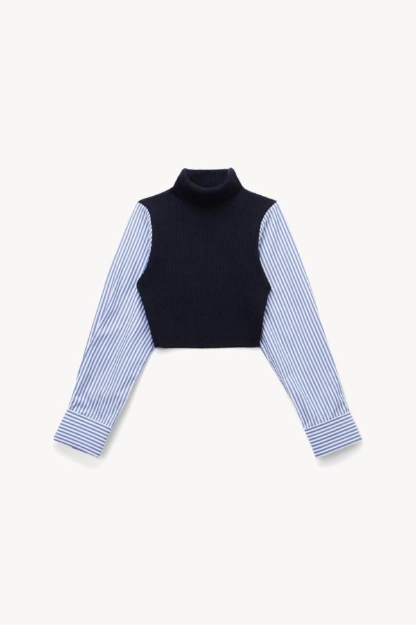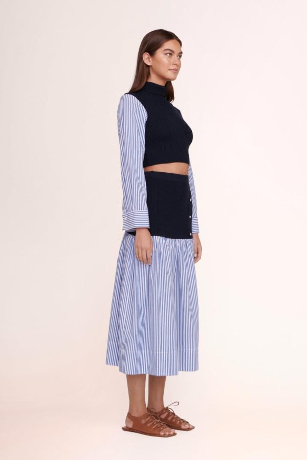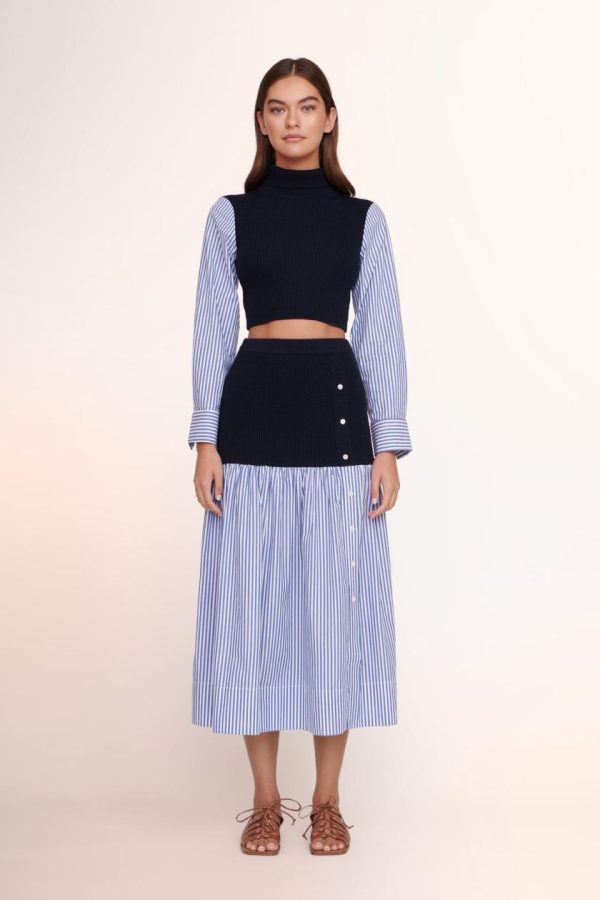 Elevate your wardrobe with this sophisticated merino wool turtleneck featuring contrast striped poplin shirt sleeves. The Louisa Top creates a perfectly coordinated ensemble when paired with the Miley Skirt for a polished, put-together look.