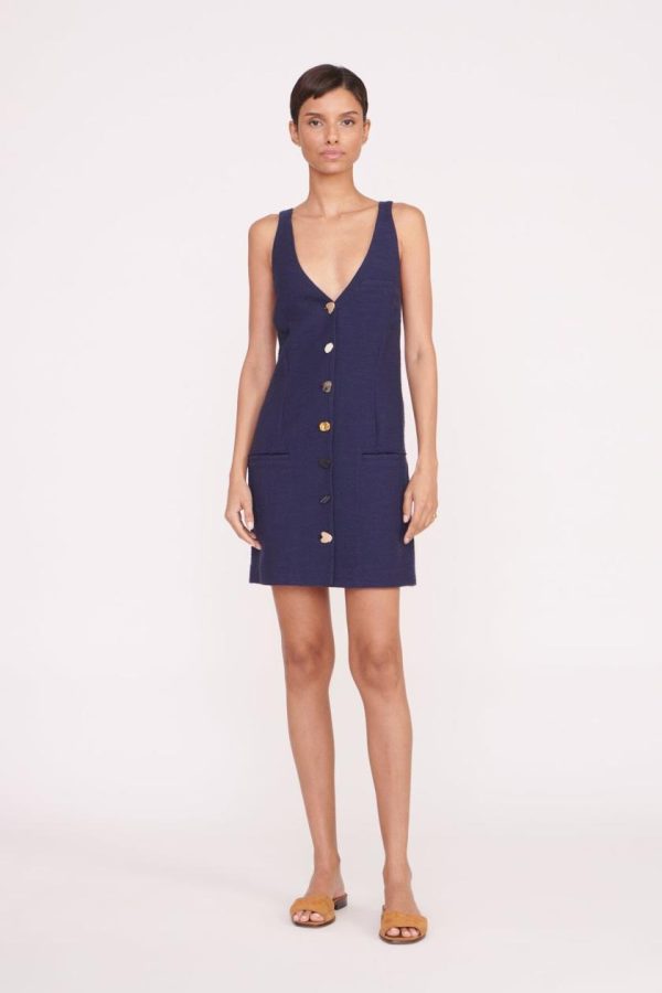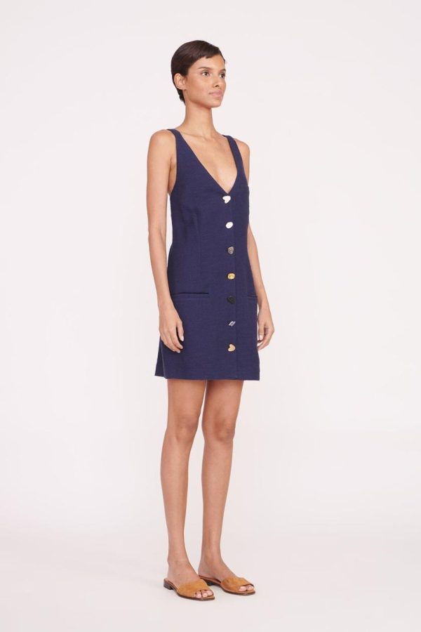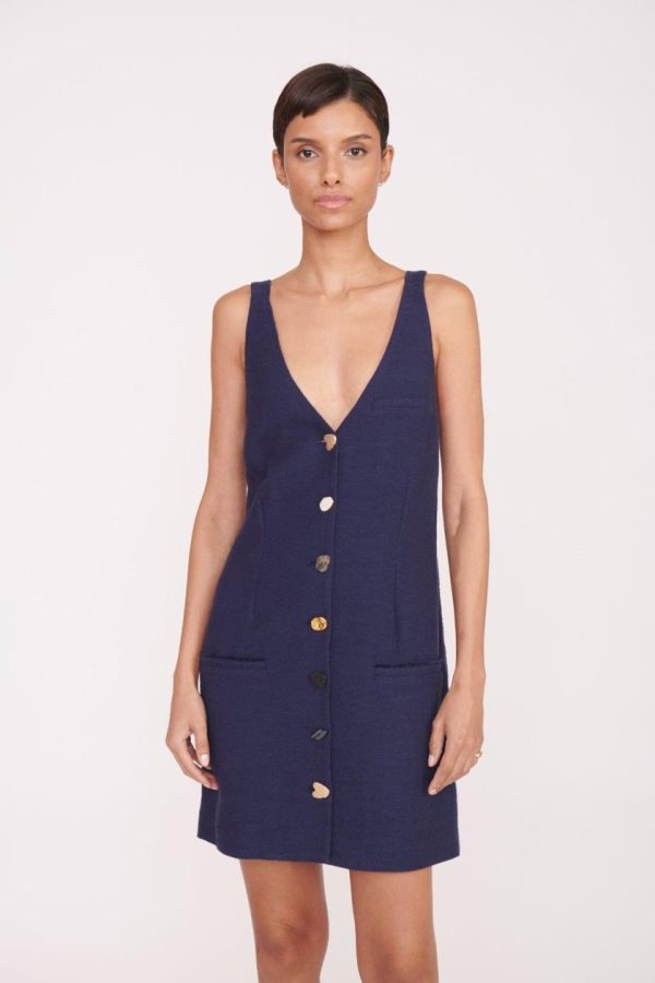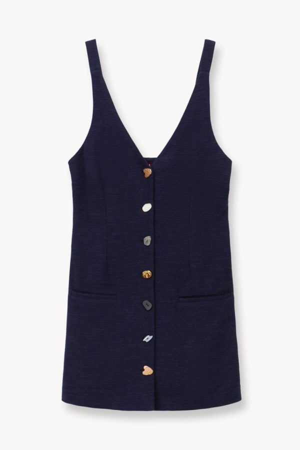 Discover the effortlessly chic Samuel mini dress, featuring a sleeveless design with distinctive mismatched button detailing. Crafted from premium structured cotton suiting fabric, this dress offers a contemporary boxy silhouette with a flattering V-neckline and two practical front pockets.