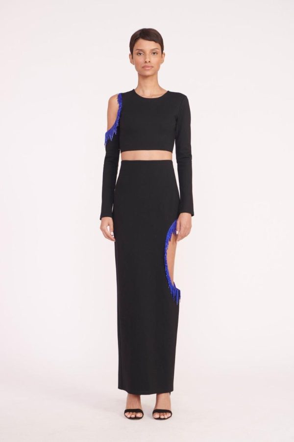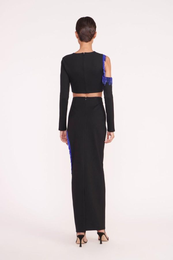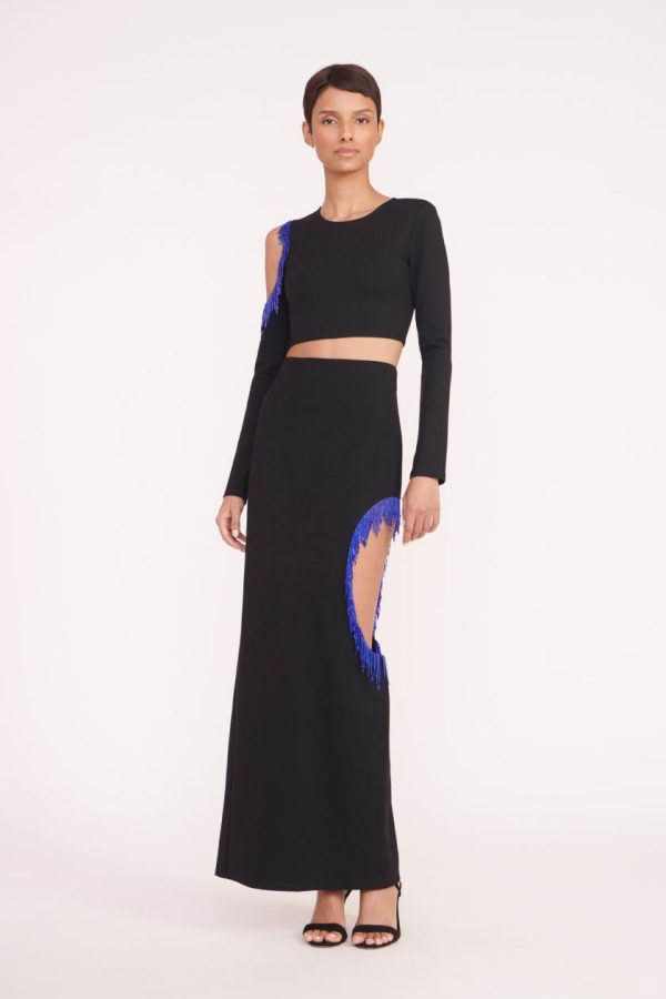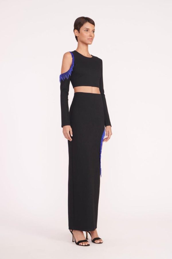 Discover our sophisticated maxi column skirt crafted from a beautifully draping ponte knit fabric. This elegant design features a flattering fitted silhouette with a stylish side cutout detail accented with delicate beaded fringe trim.
