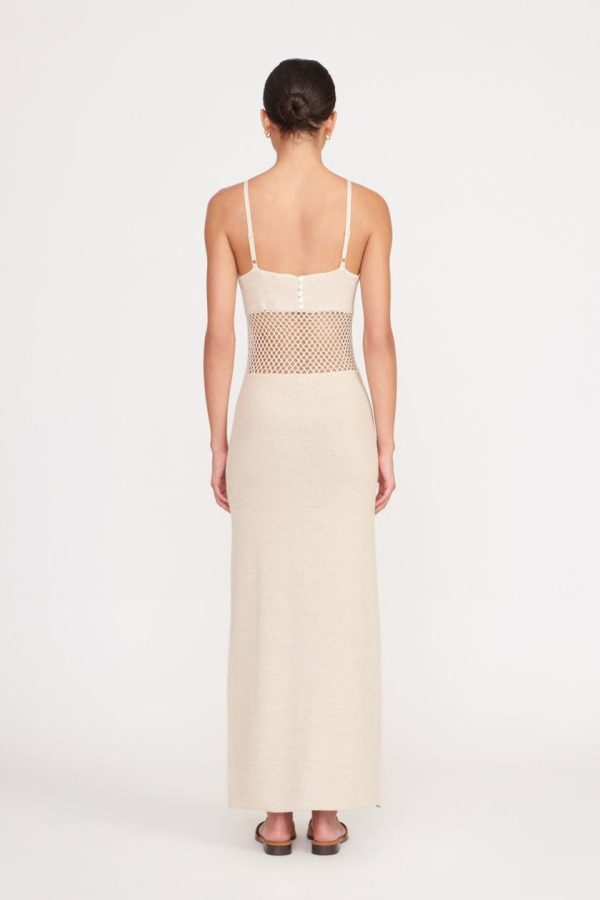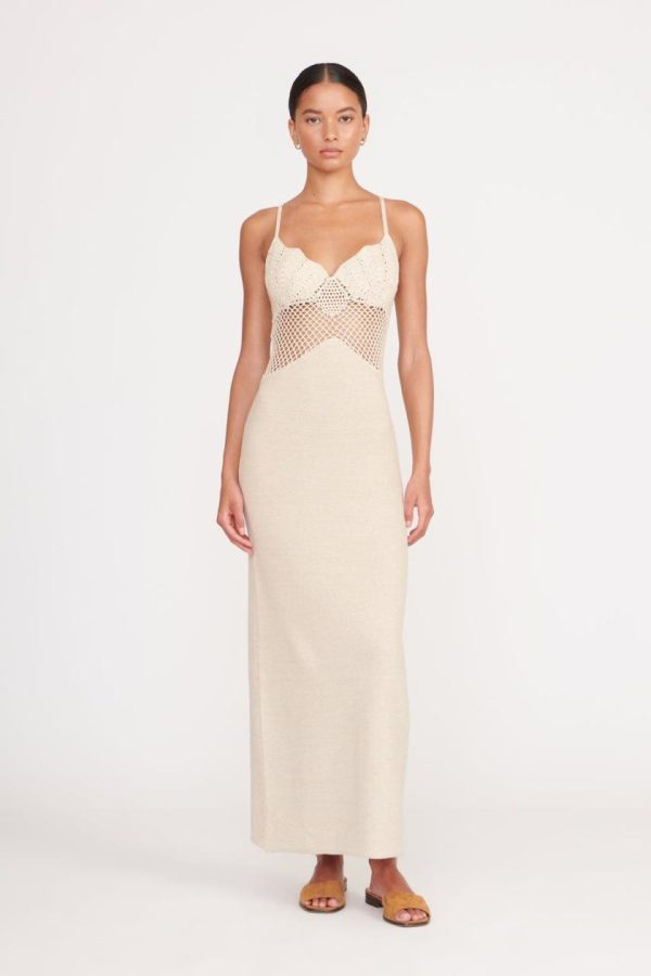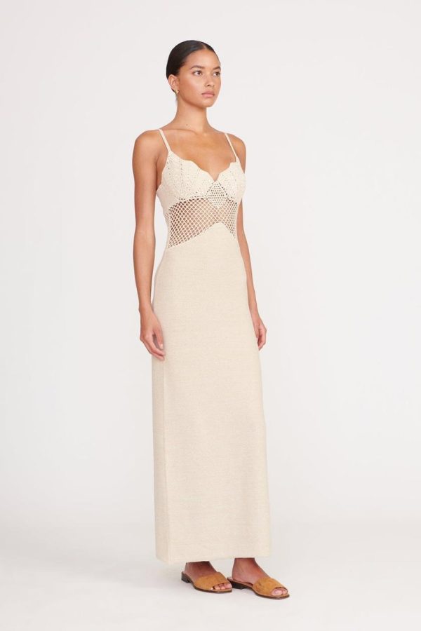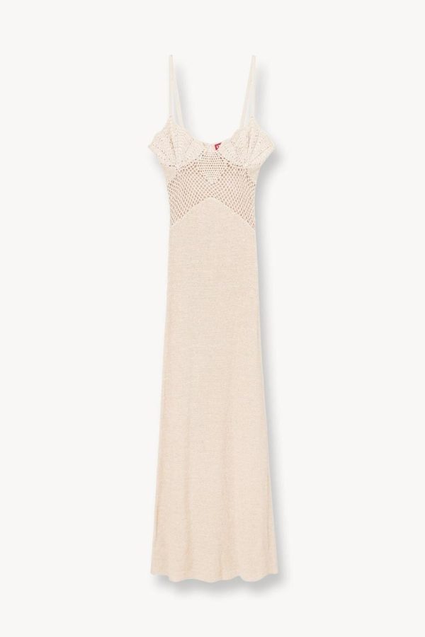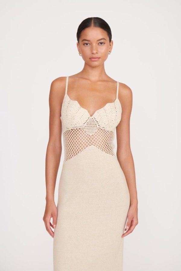 The Tara Dress features an elegant crochet maxi silhouette with delicate spaghetti straps and sophisticated sheer crochet panel detailing. This stunning dress showcases a beautifully fitted bodice and skirt, accentuated with exquisite shell cup detailing at the bust for a feminine touch.