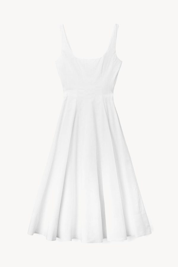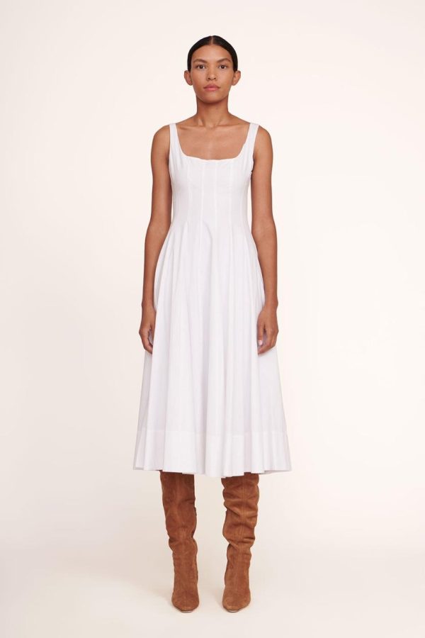 The Wells Dress showcases a corset-style panel construction that sculpts a beautifully fitted silhouette through the waist, flowing into a graceful midi-length a-line skirt. Crafted from premium lightweight cotton poplin for effortless elegance.