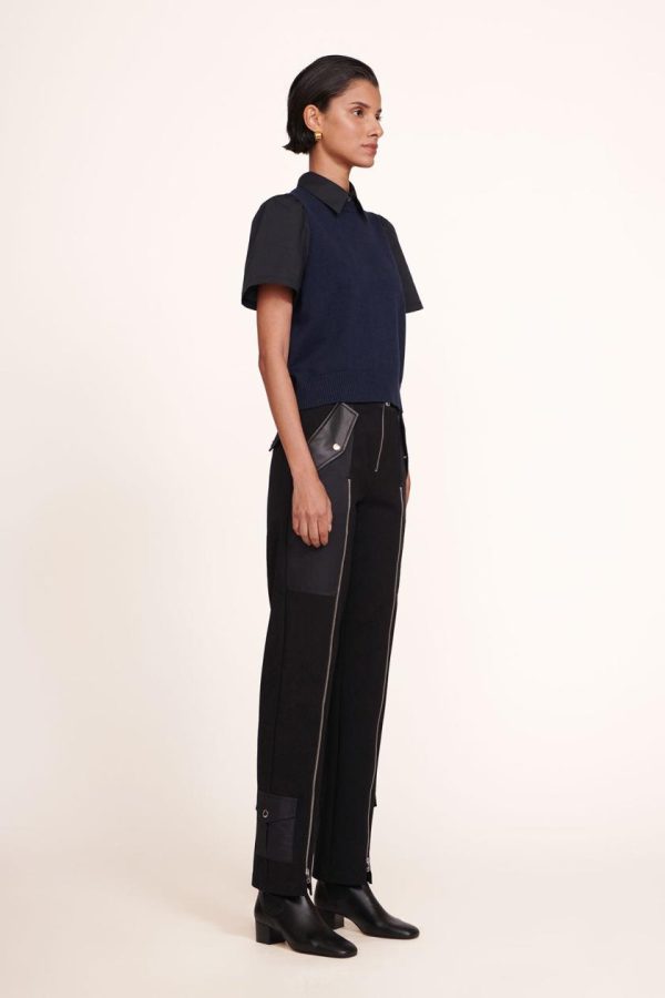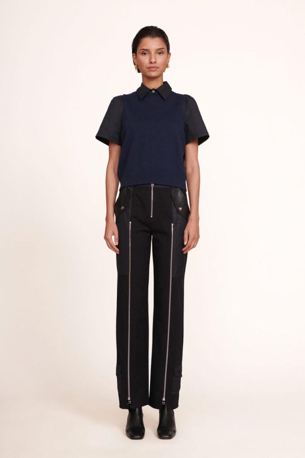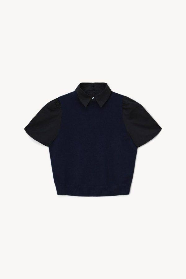 The Arya Top is a fine knit top with a short woven sleeve and removable collar.