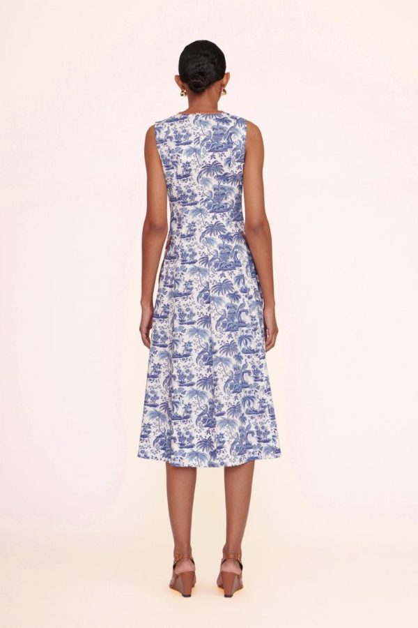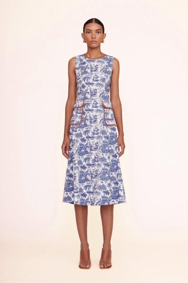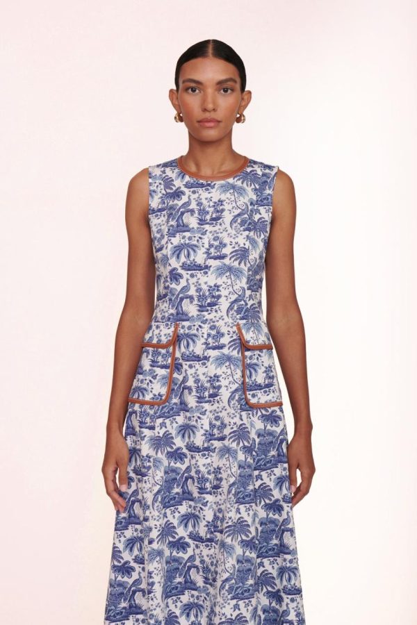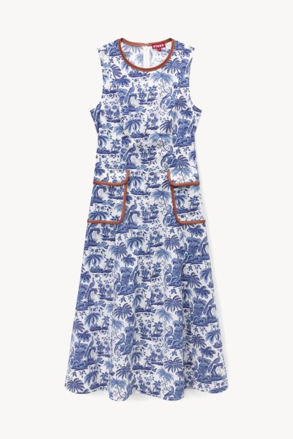 The Bait Dress is a midi-length toile poplin dress featuring two vegan leather trimmed front pockets. Sleeveless with a high neckline, fitted bodice, and flared skirt; this is a great transitional piece for day-to-night.
