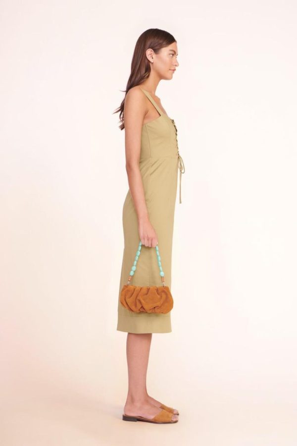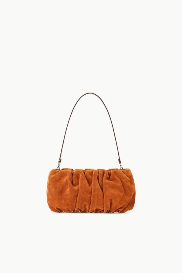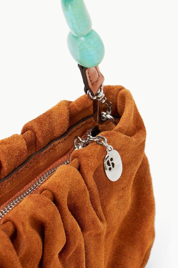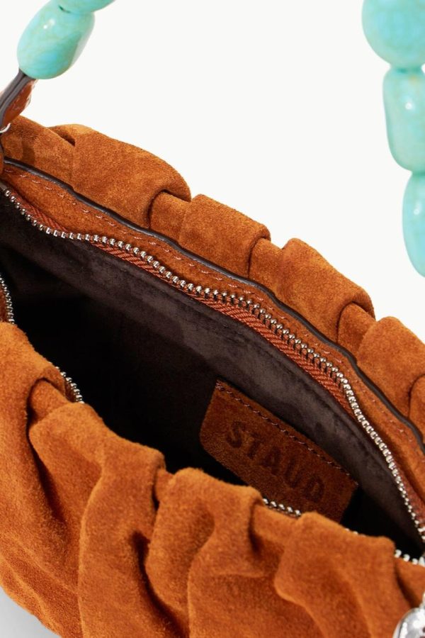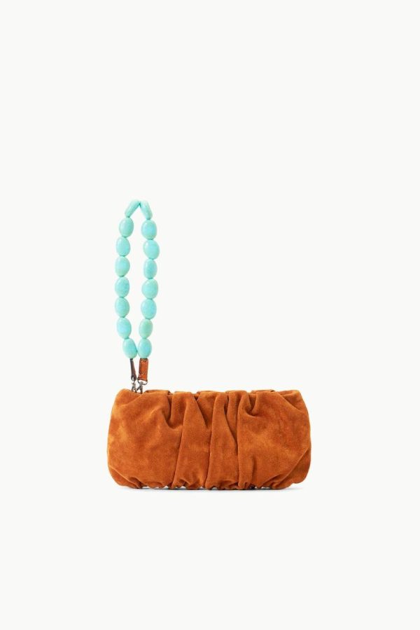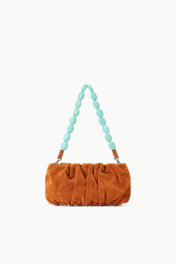 A best seller update for the season, the convertible suede Bean Bag features beaded and leather detachable straps with suede lining.