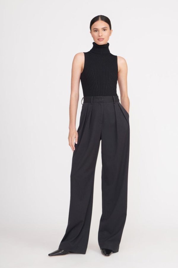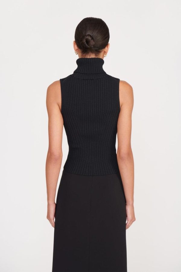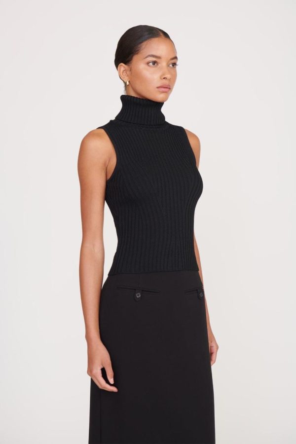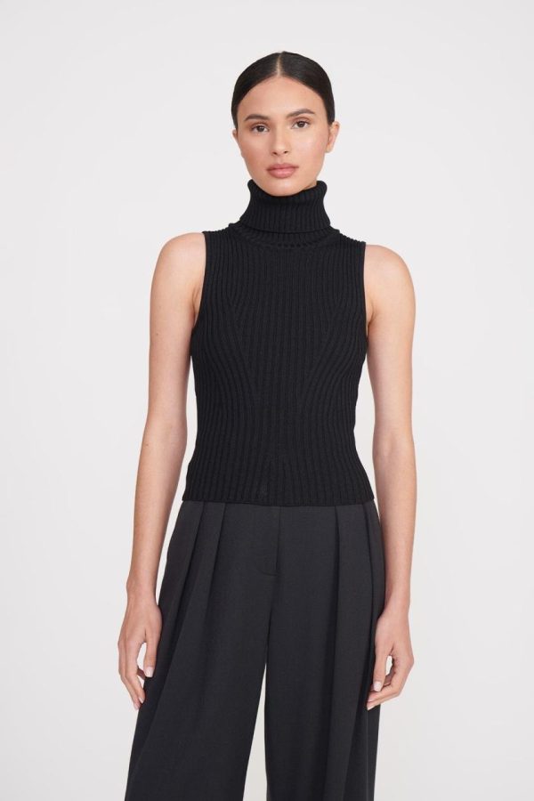 A sleeveless turtleneck top made out of a stretchy rib knit fabric. This style offers a fitted silhouette and full fashioning pattern throughout.
