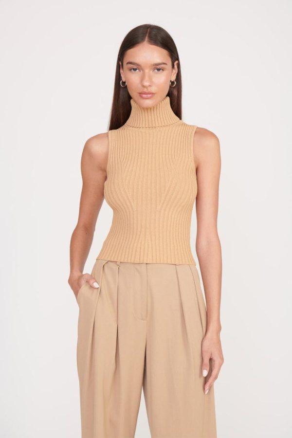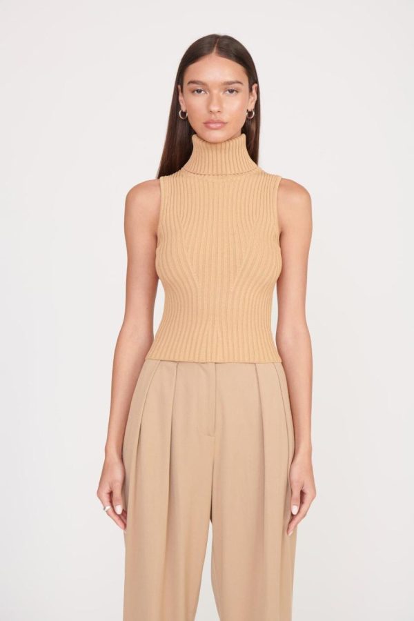 A sleeveless turtleneck top made out of a stretchy rib knit fabric. This style offers a fitted silhouette and full fashioning pattern throughout.