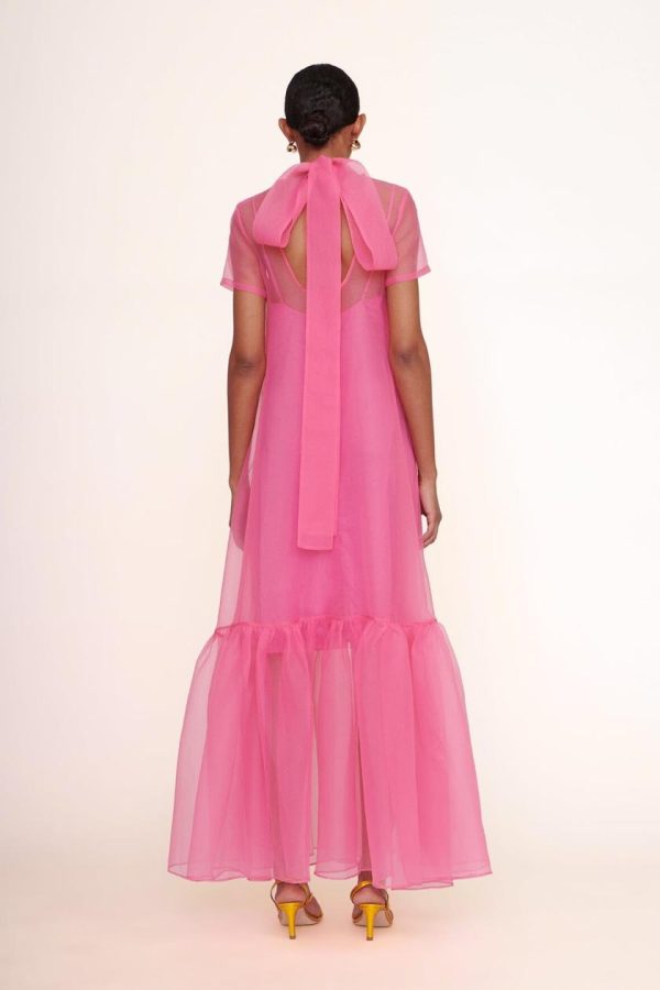 The Calluna Dress is a high neck organza gown with scoop back and functional neck tie. This style features a tiered ruffle hem.