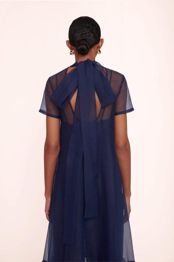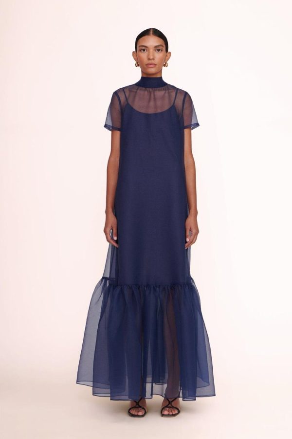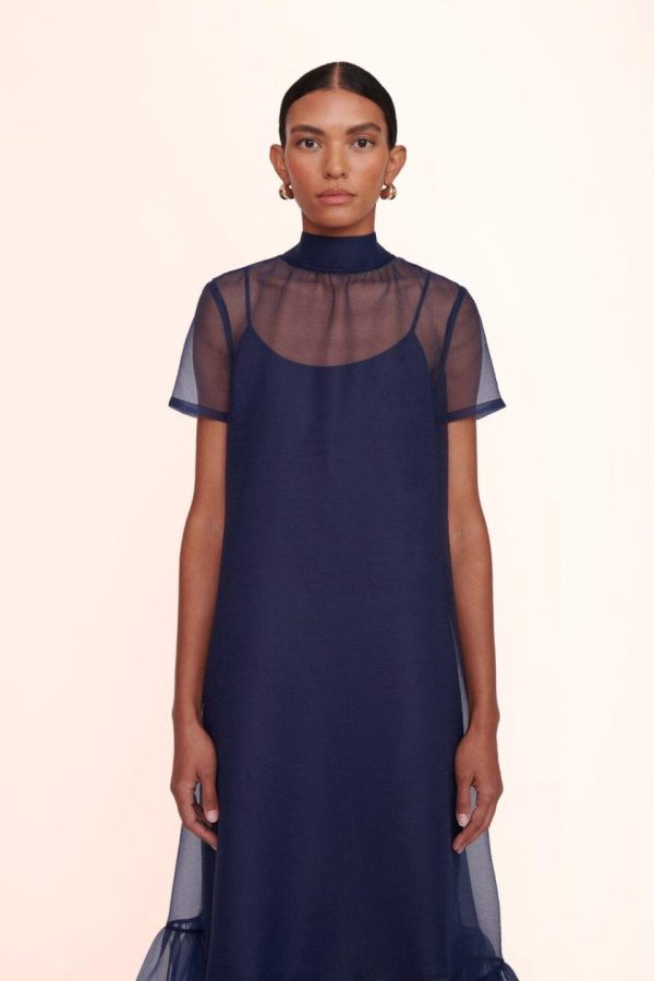 The Calluna Dress is a high neck organza gown with scoop back and functional neck tie. This style features a tiered skirt ruffle hem.