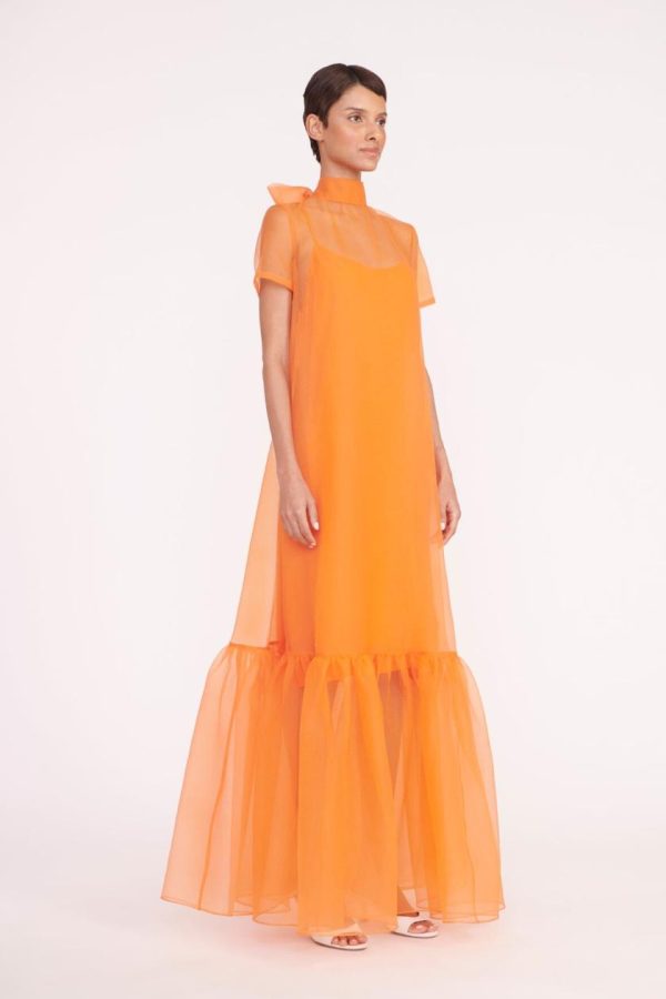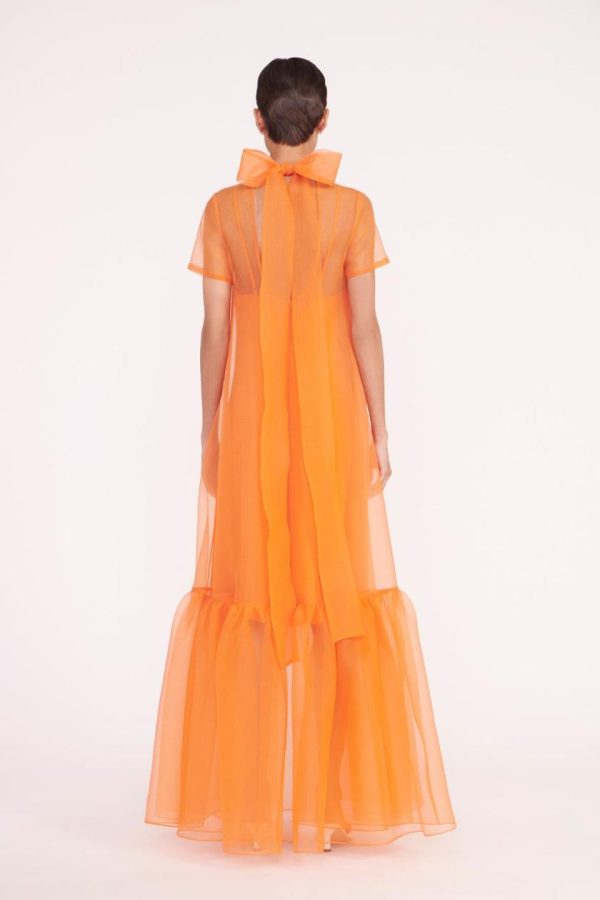 The Calluna Dress is a high neck organza gown with scoop back and functional neck tie. This style features a tiered skirt ruffle hem.