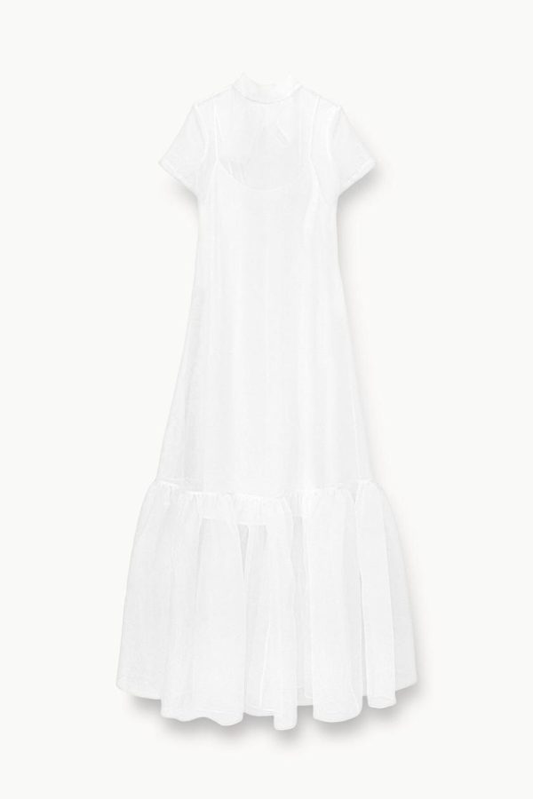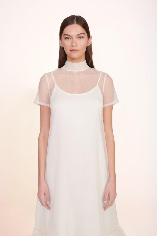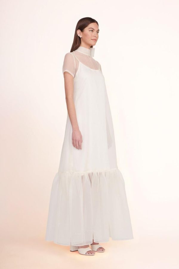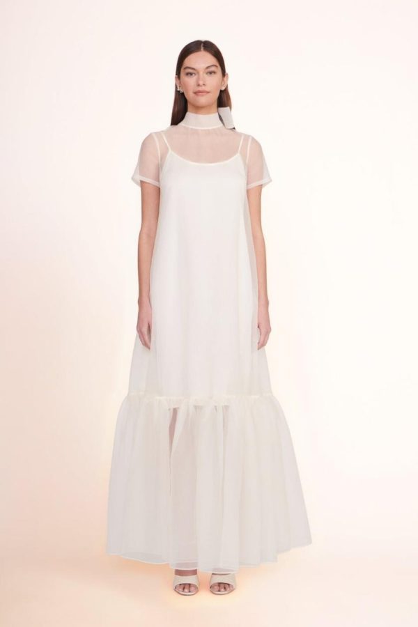 The Calluna Dress is a high neck organza gown with scoop back and functional neck tie. This style features a tiered skirt ruffle hem.