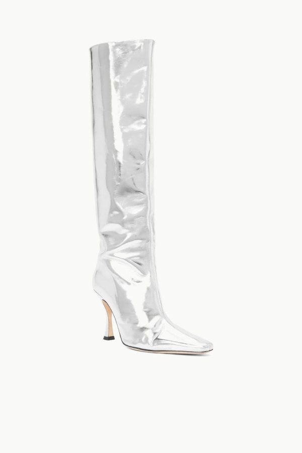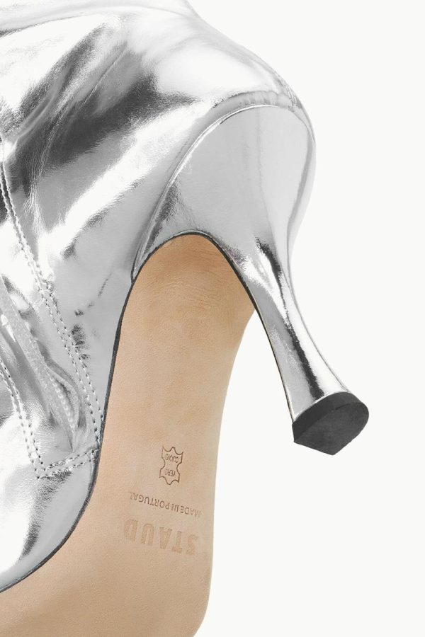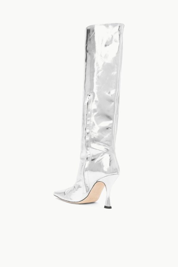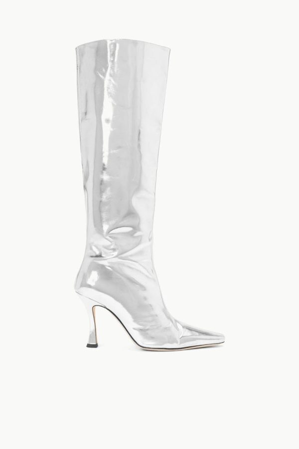 Our statement boot for the season. An updated high heel boot in a bold mirrored chrome leather. The Cami can be dressed up for night or worn casually during daytime.