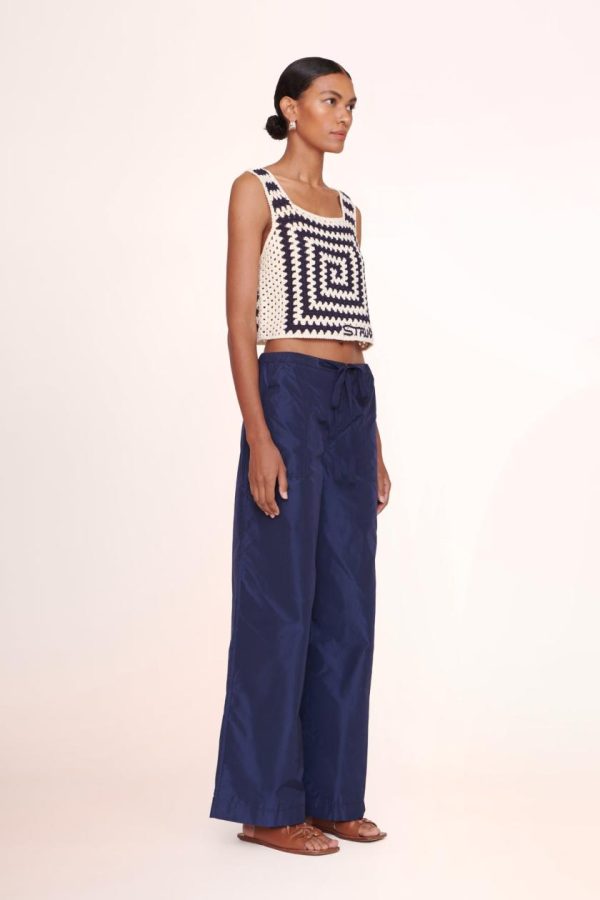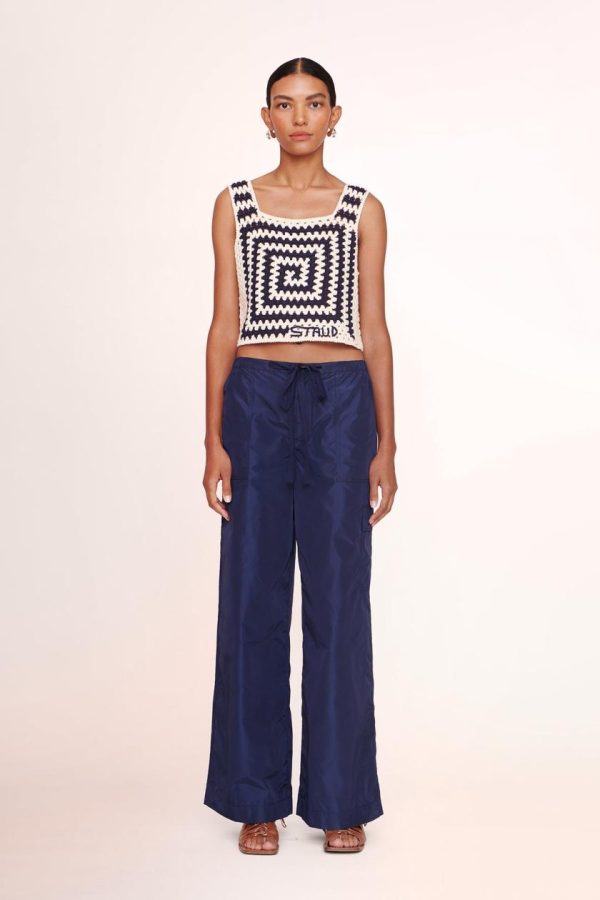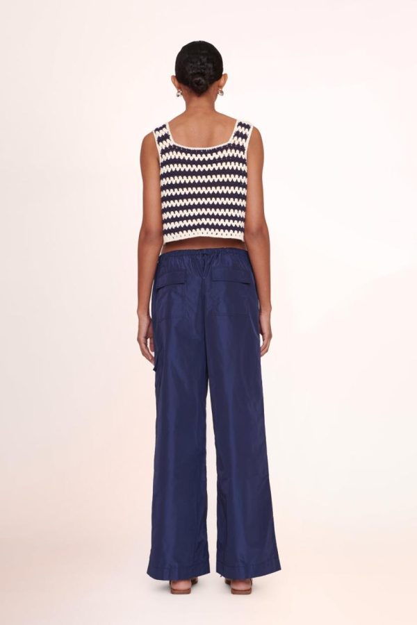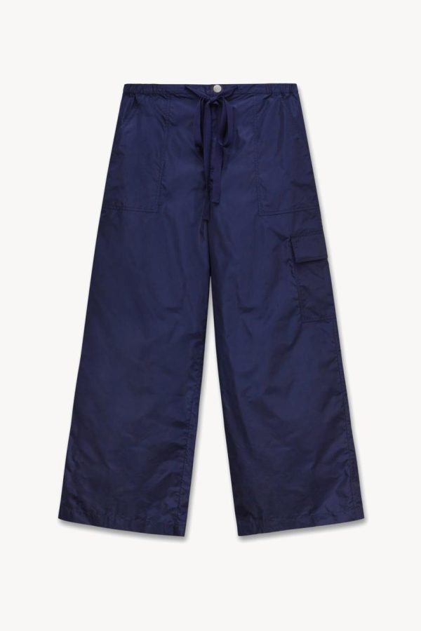 The Camila is a wide leg, low rise cargo pant made out of taffeta. This style features an adjustable waist tie and cargo pockets.