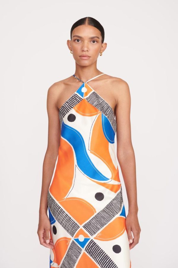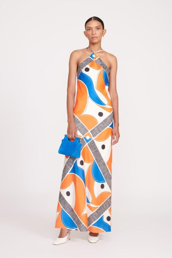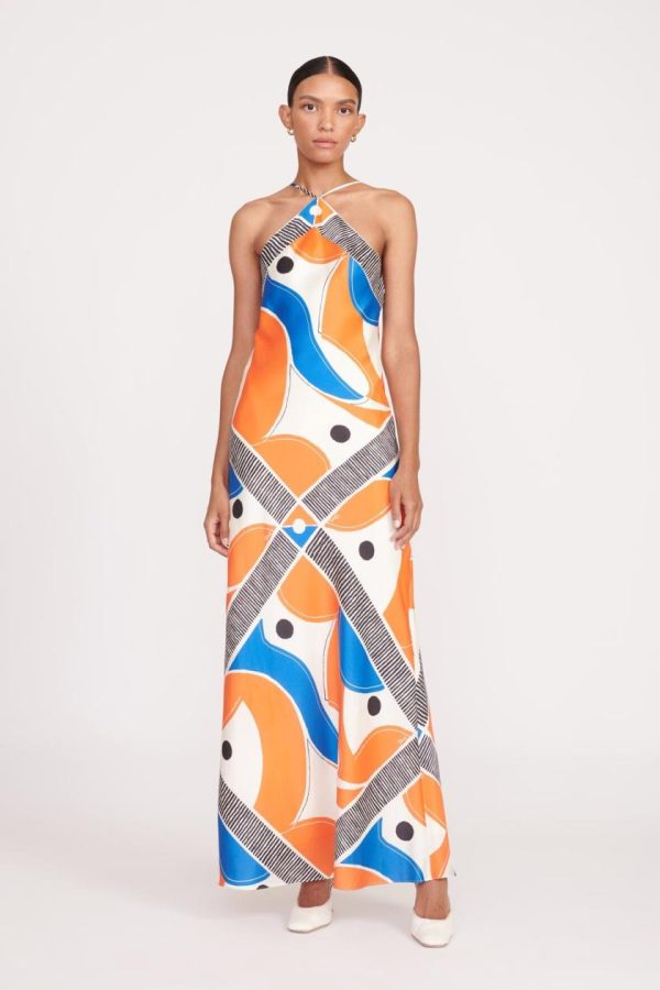 A fitted bias maxi dress in updated in a scarf-inspired abstract pattern. The Cubism Dress features a halter neckline and adjustable straps at the back.
