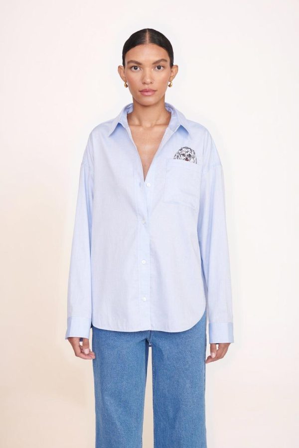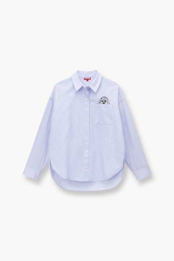 An oversized collared shirt with a single patch pocket in a cotton poplin fabric.
