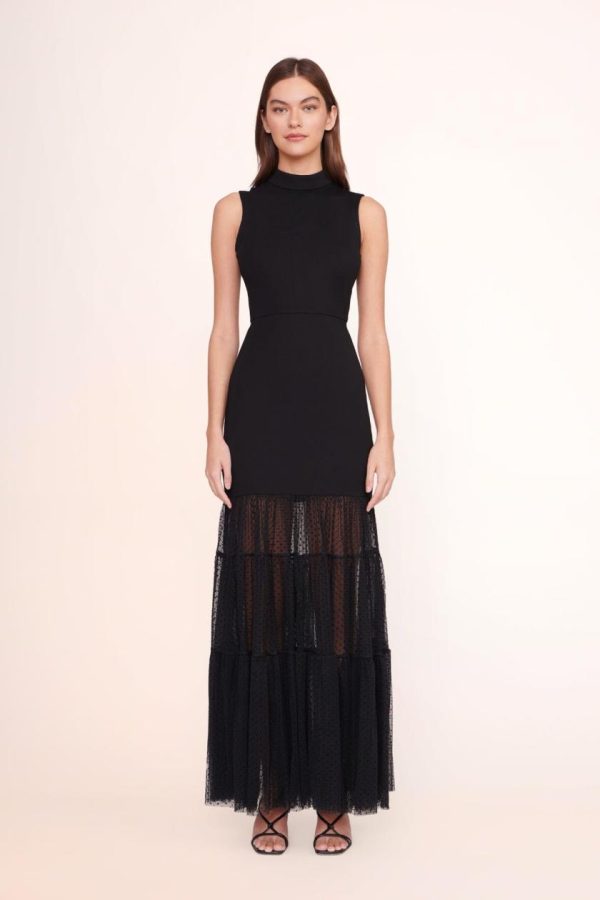 A fitted knit evening gown, the Daffodil Dress features a stretchy fitted bodice with a dotted flocked tulle skirt and mock neck collar.