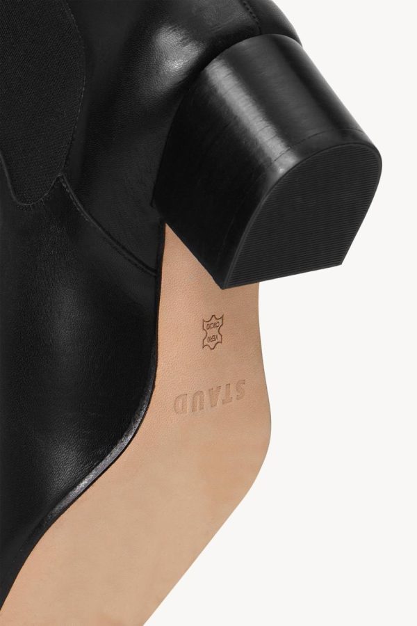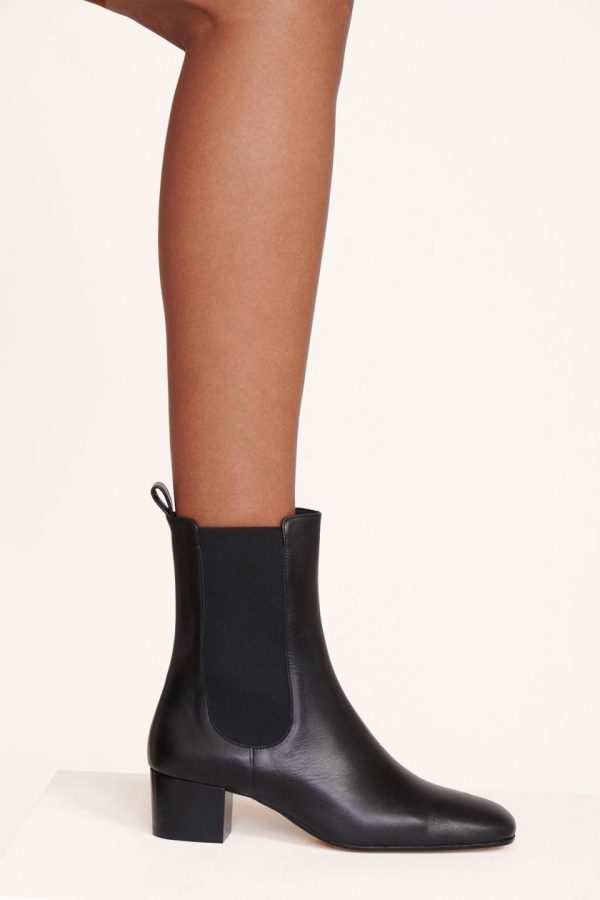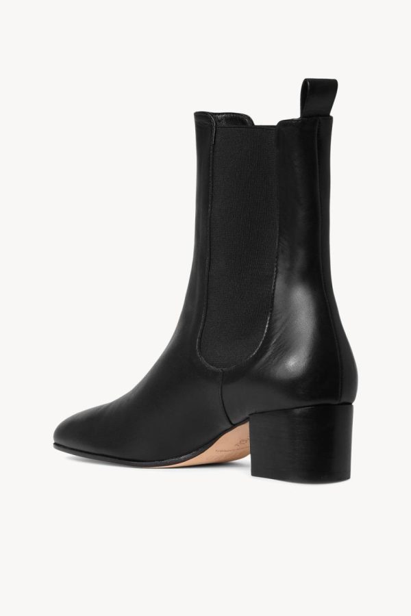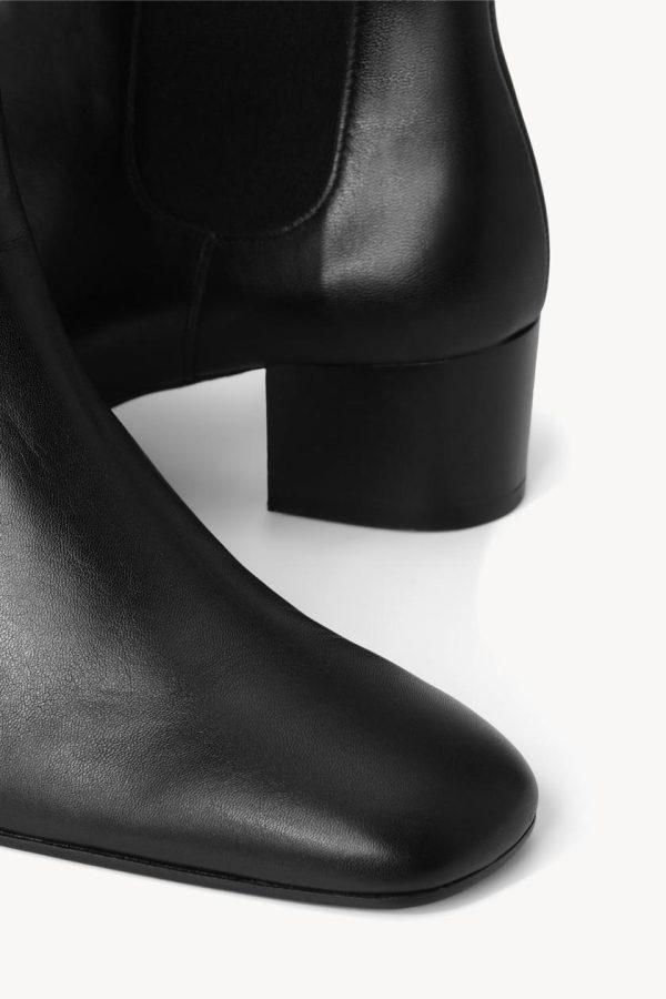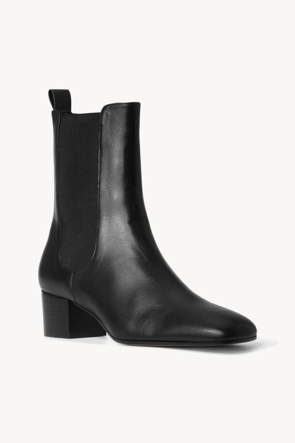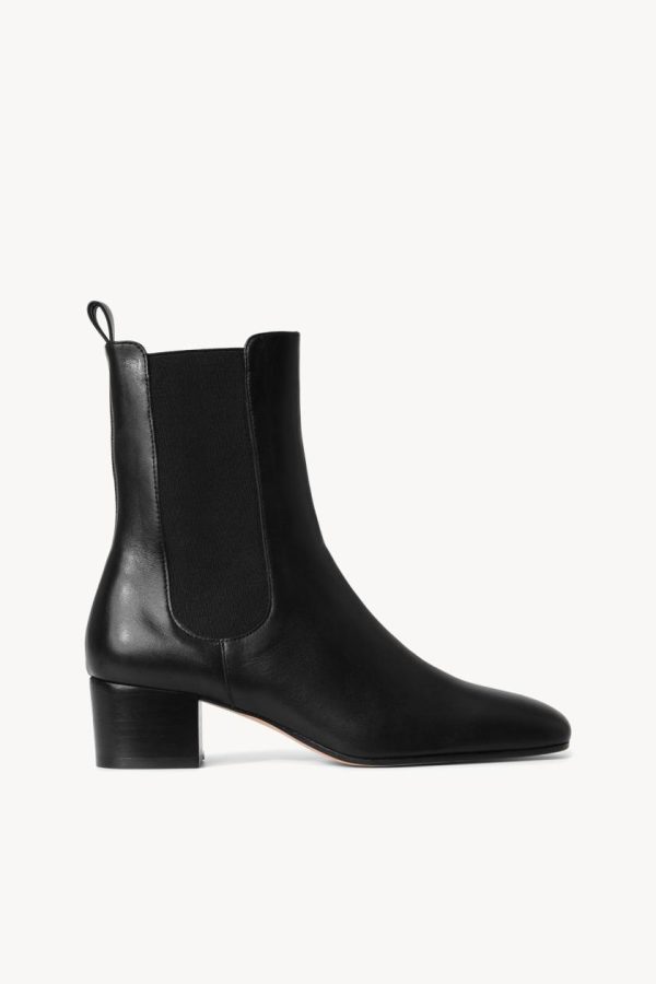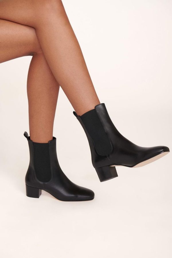 A slim fit boot with elasticized gusset and block heel, the Daphne features a square toe, leather upper, and back pull tabs.