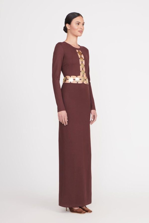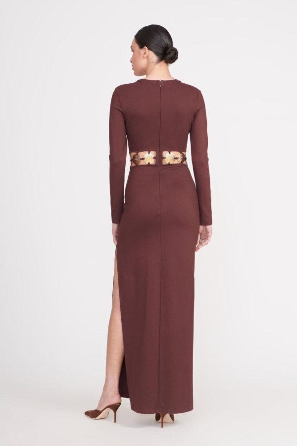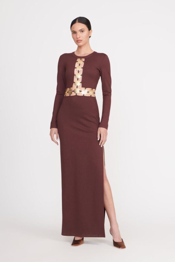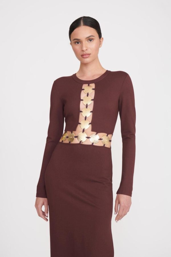 A long-sleeved maxi dress in our soft, form-fitting ponte fabric. The Delphine features a front and waist cutout with logo-embossed coins and a side slit.