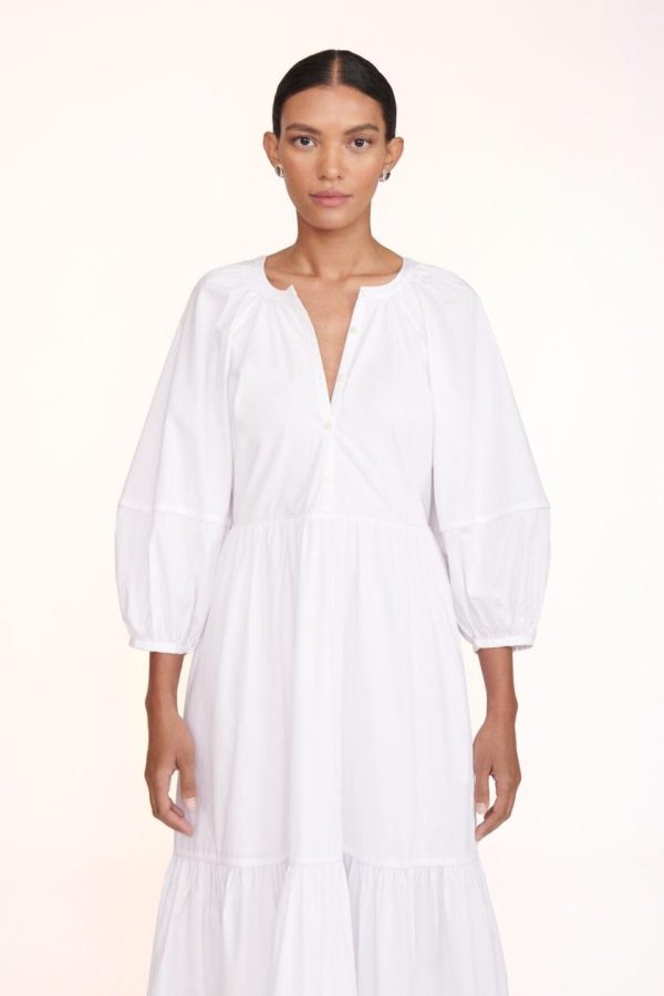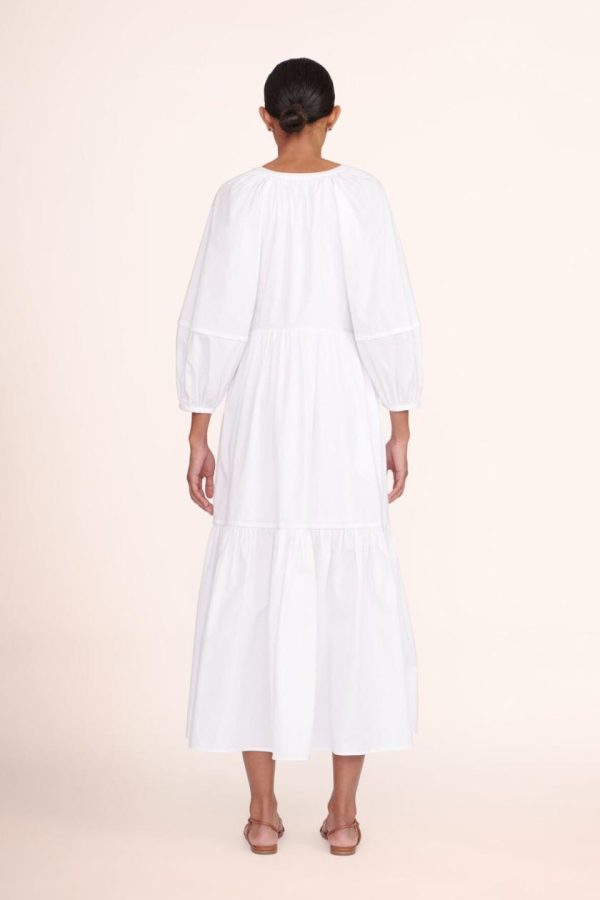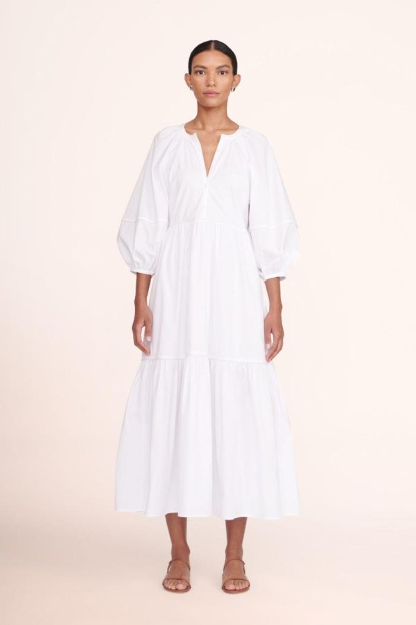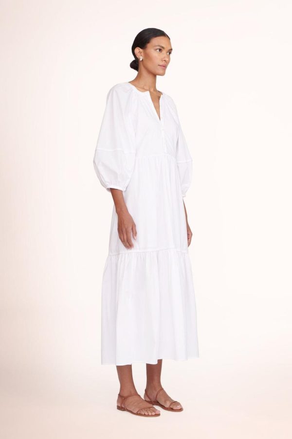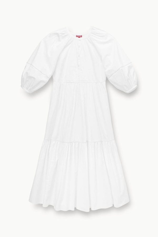 The Demi Dress is a three quarter sleeved maxi dress featuring a button front and tiered skirt.
