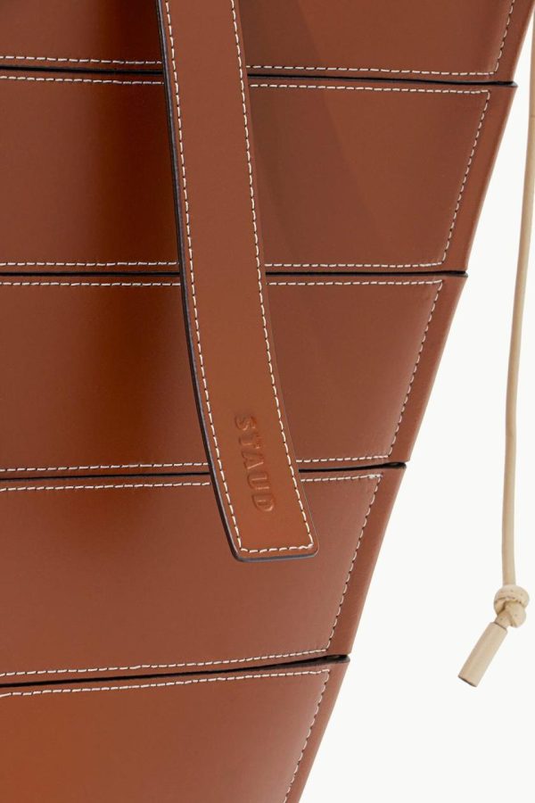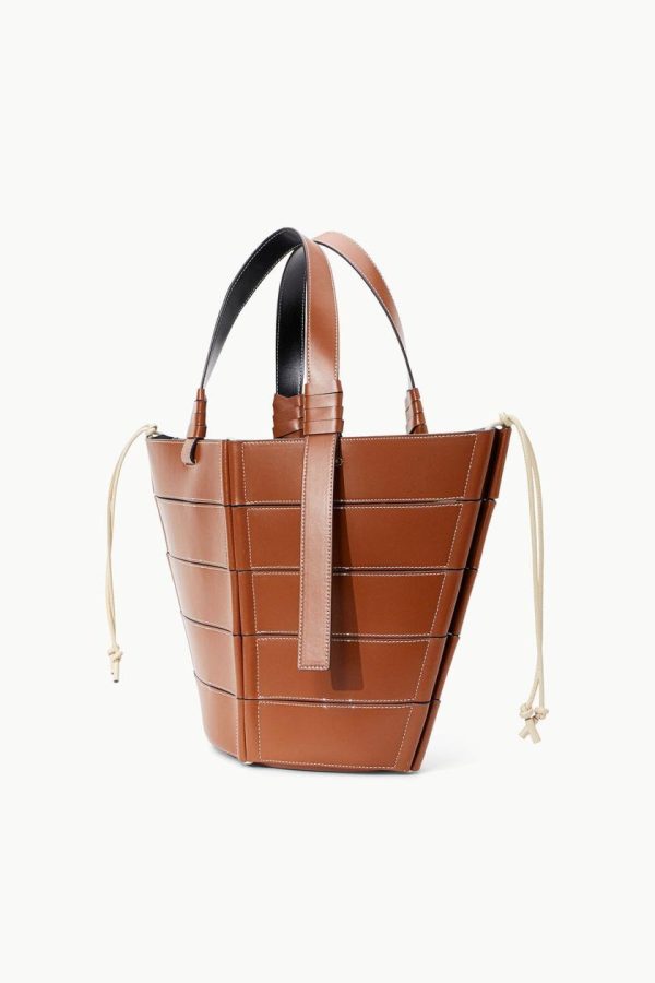 The Diamond Tote features a slatted leather construction with natural cotton decorative cords and a removable canvas drawstring pouch with interior pocket.