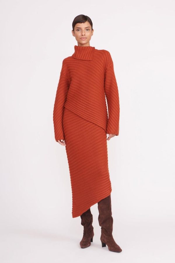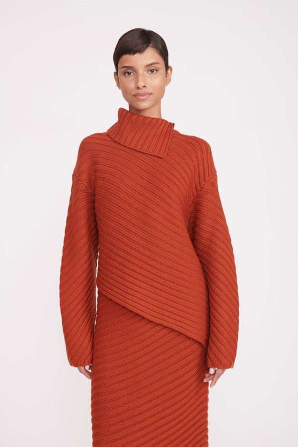 The Engrave Sweater is a chunky long-sleeve sweater with rib stitching and an asymmetrical turtleneck collar and hem.