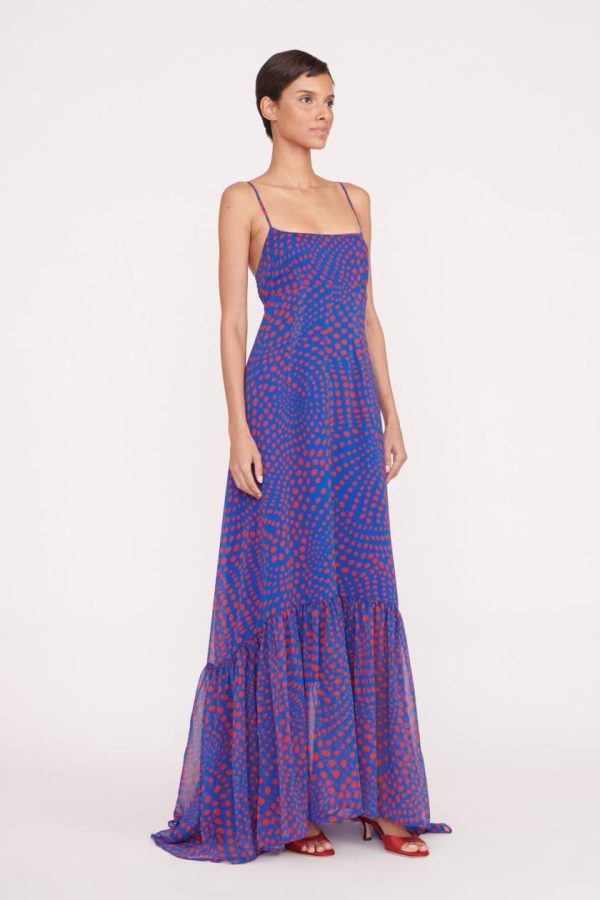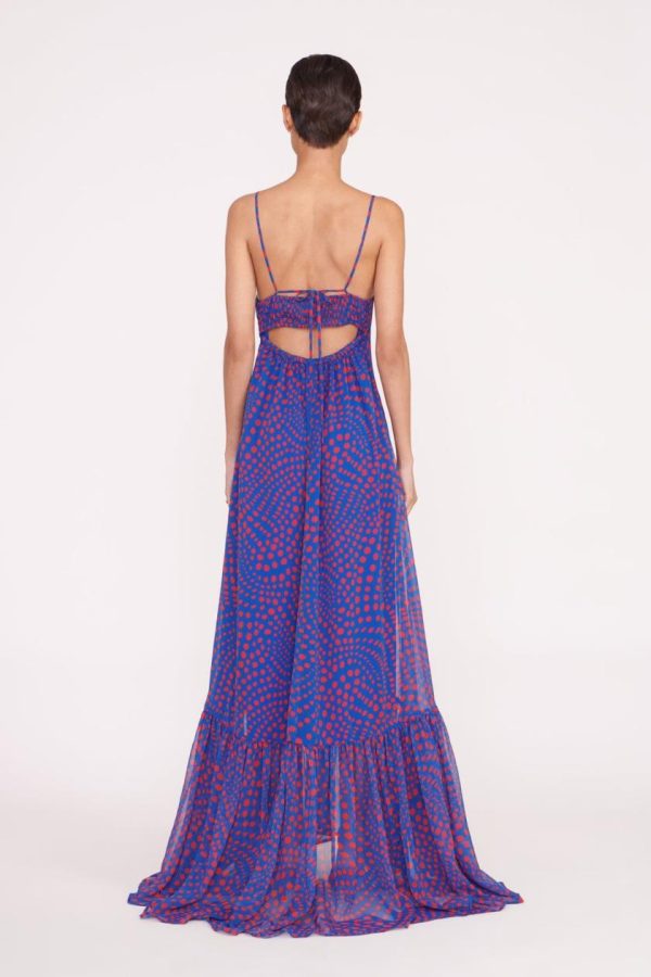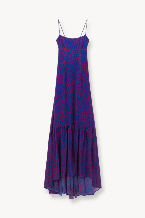 A full length gown constructed out of a printed crinkle chiffon fabric, the Florence Dress offers a fitted empire waistline and flowwy skirt. This style features a peplum hem and spaghetti straps which tie at the back.