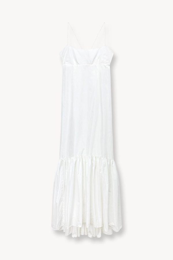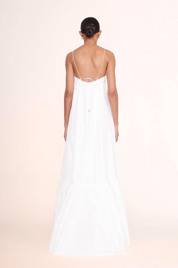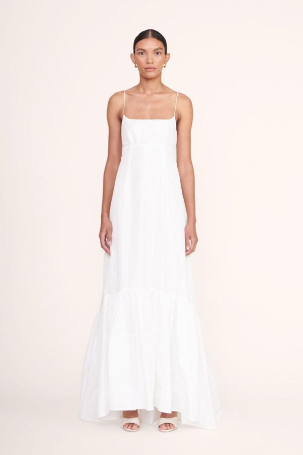 A full length gown made out of taffeta. The Florence Dress features thin spaghetti straps and a tall tier hem.