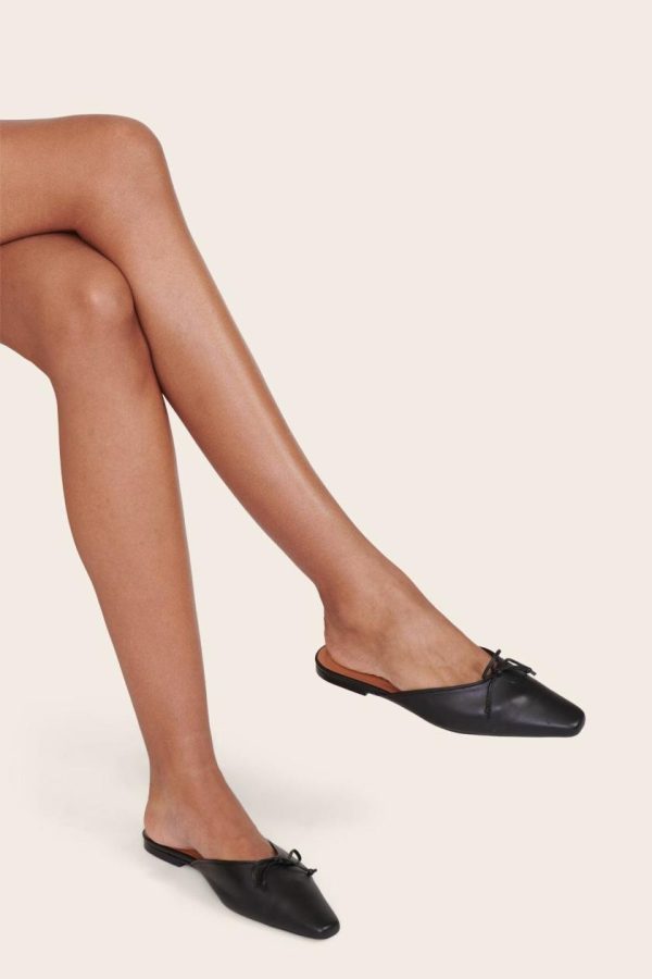 A flat leather mule, the Gina features a sleek pointed toe and bow detail.