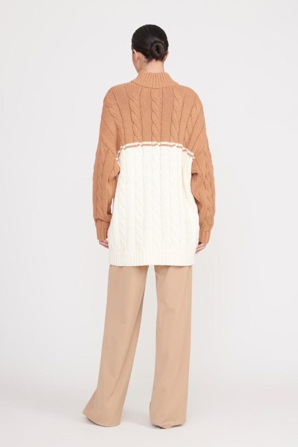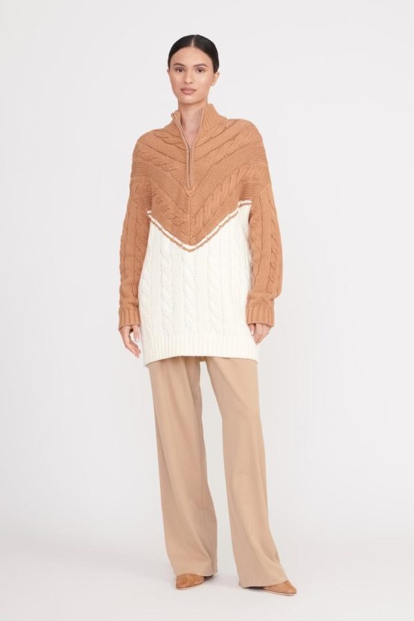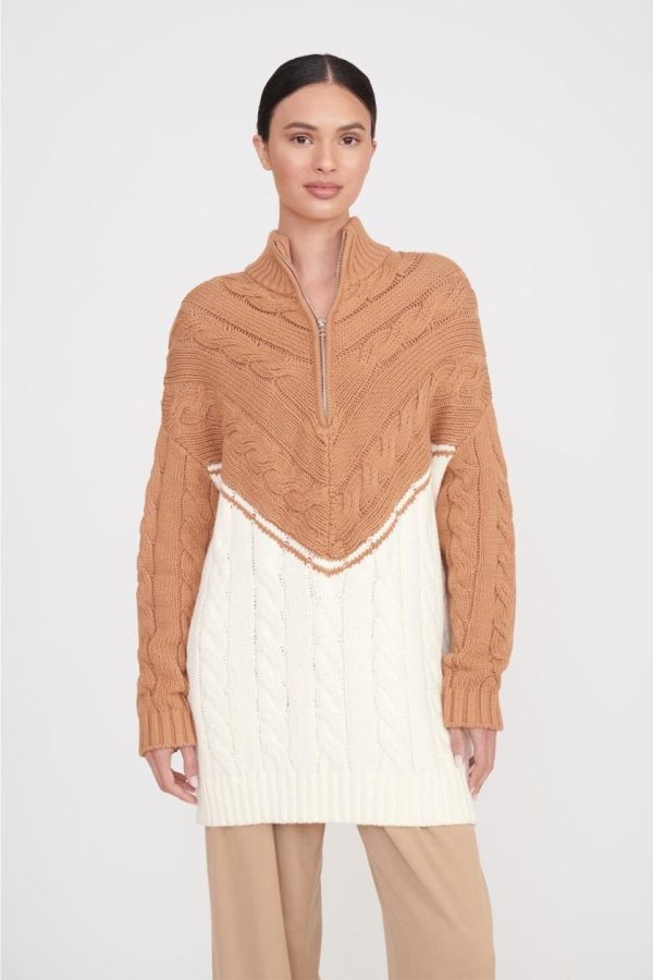 Our signature oversized boyfriend sweater gets a seasonal update with contrast whipstitch detailing. This style features a half zip and mixed knit patterns.
