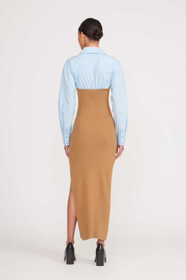 The Hazel is a poplin knit combo midi dress. The dress has fully fashion corset detailing attached to a long sleeve poplin shirt.
