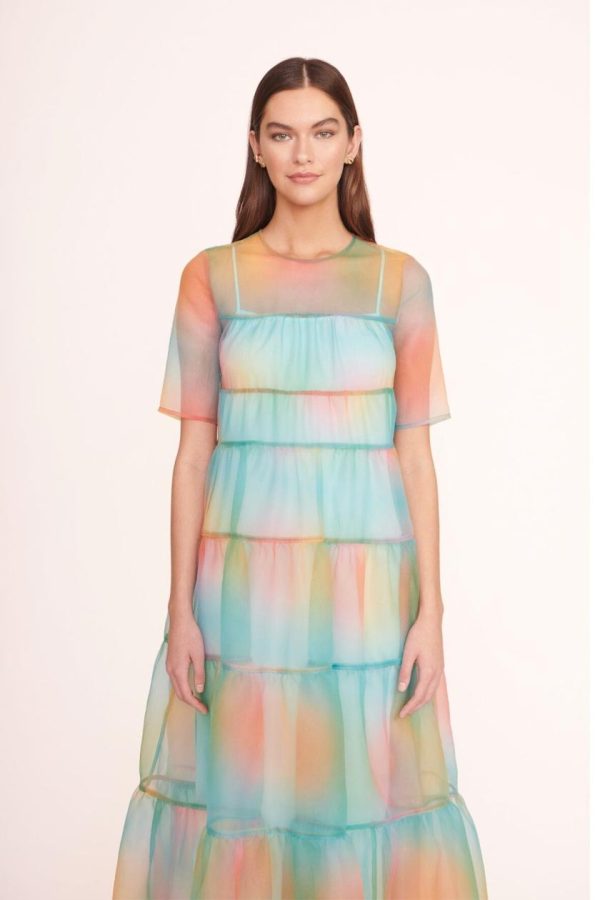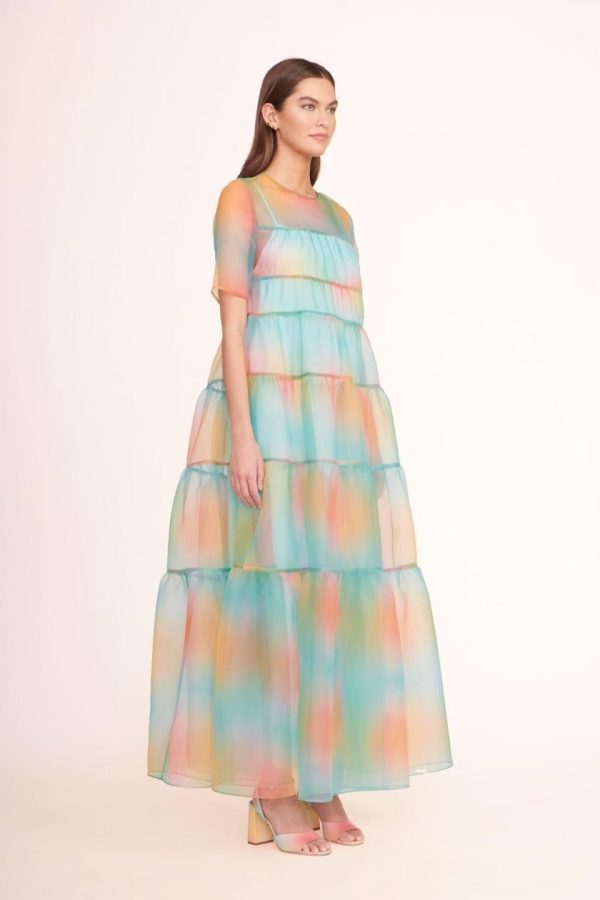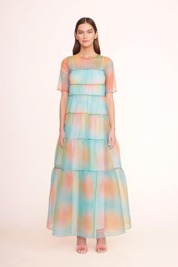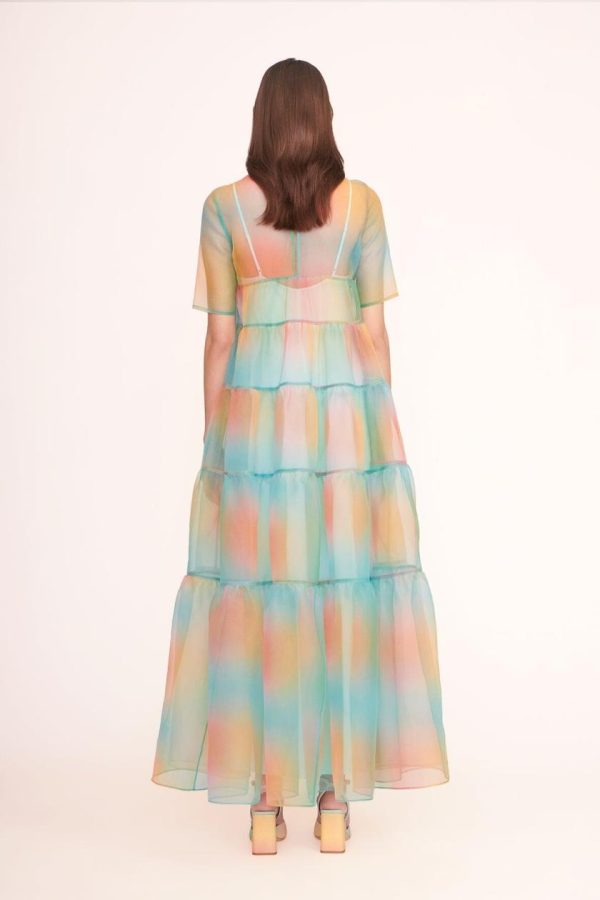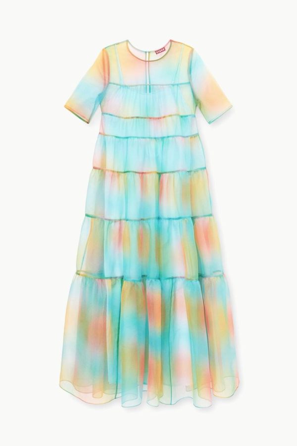 The Hyacinth Dress in sheer organza is a tiered maxi with a single back button closure. This style includes a removable inner slip.