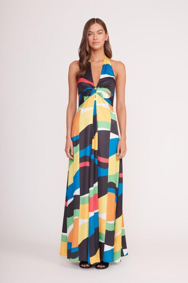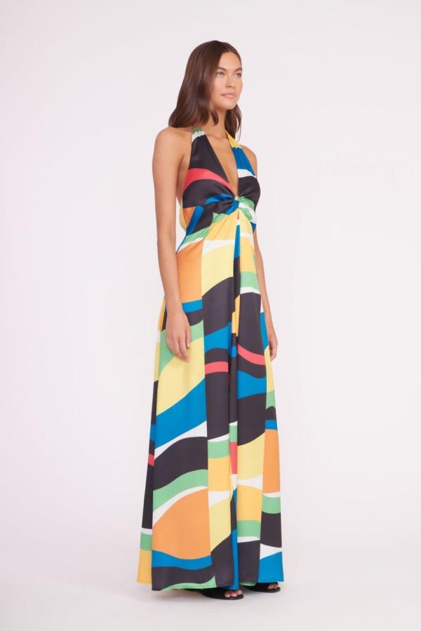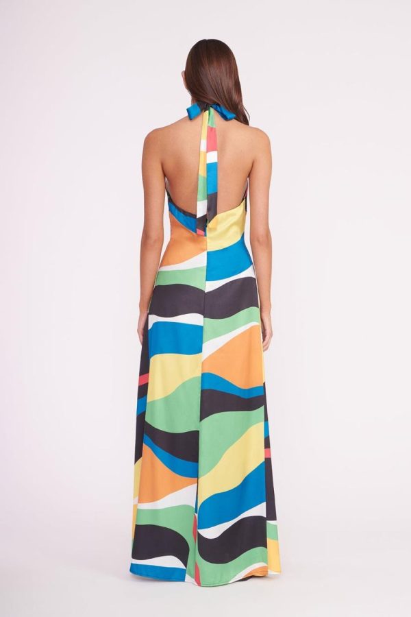 The Jennifer Dress is a new silhouette that can be dressed up or down, this style features a halter tie at the neck, a deep v-neck bodice with a twist detail, and a flowy a-line skirt in our summer Marble Wave print.