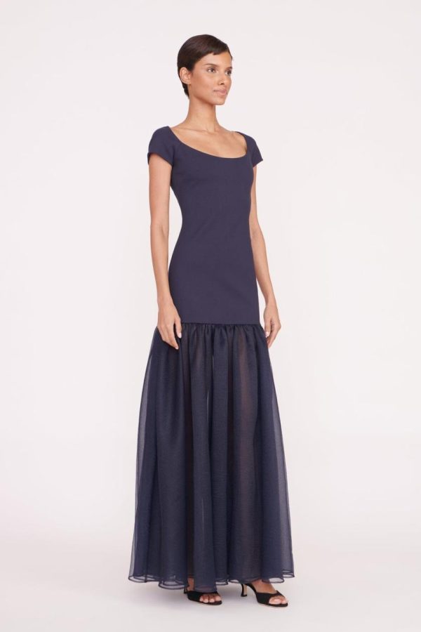 A mixed media maxi dress, this style features a fitted bodice constructed out of a figure-flattering knit ponte fabric and a full organza tier at the hem.