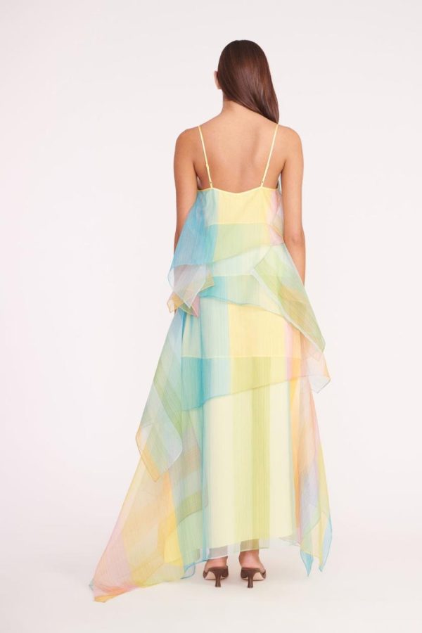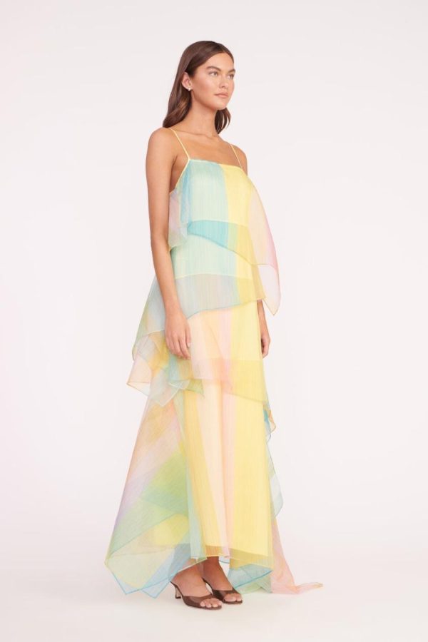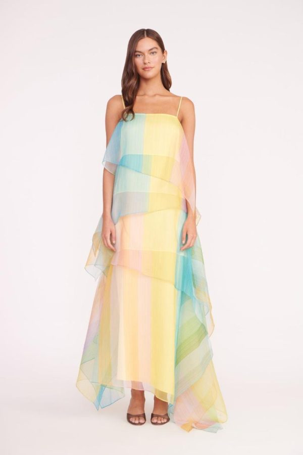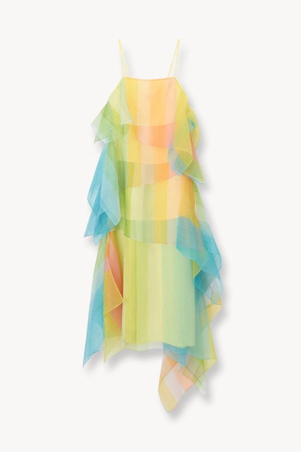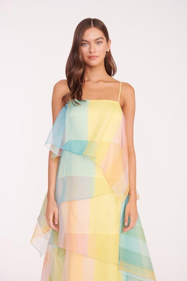 An asymmetrical, tiered organza gown in a colorful ombre print. The Kyla Dress features spaghetti straps and a built-in slip.