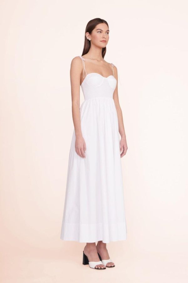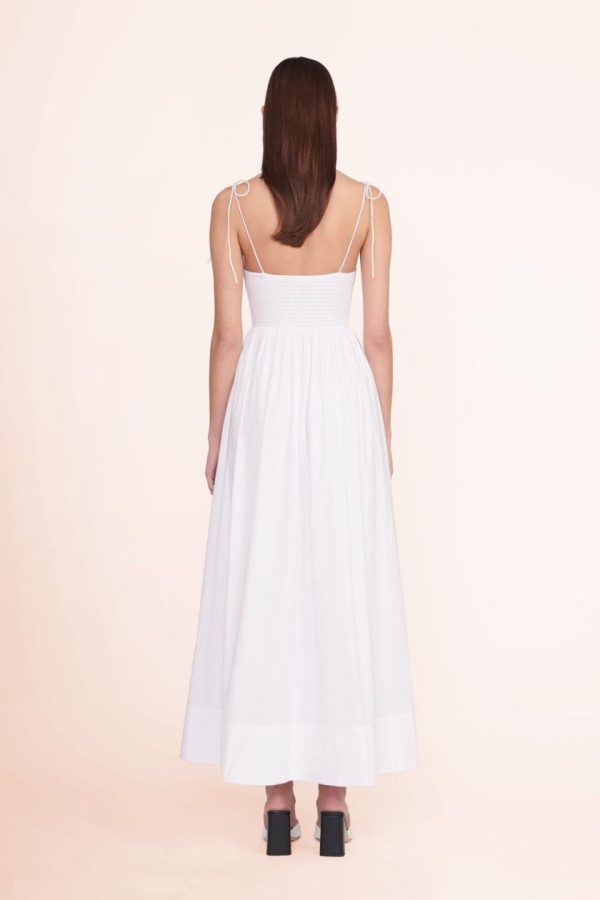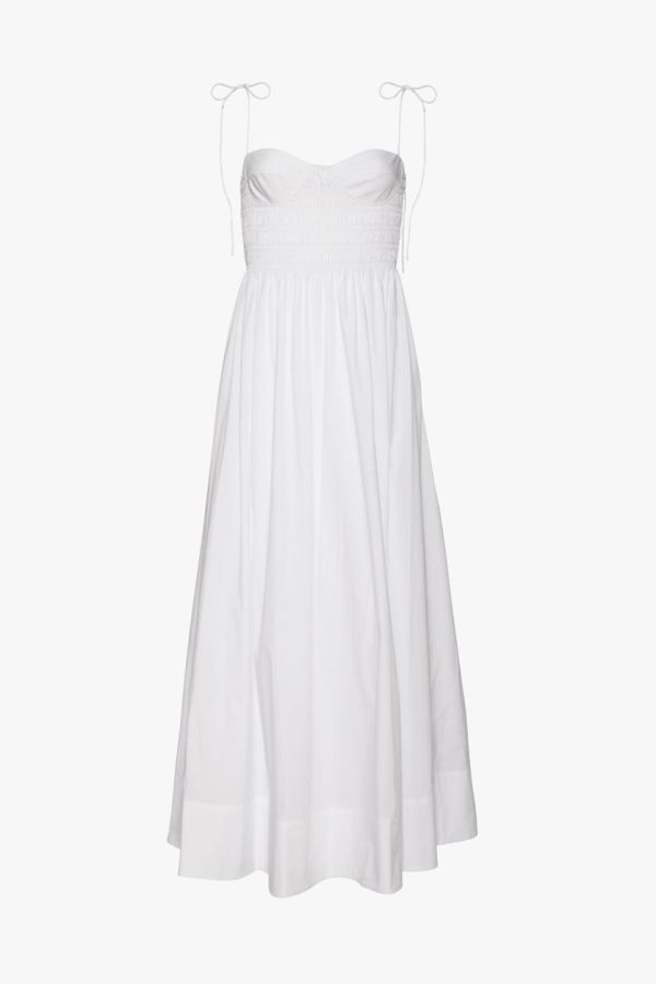 A cotton poplin maxi dress, the Landry Dress features a smocked corset bodice with adjustable tie straps. This style has a full skirt with shirring details and side seam pockets.