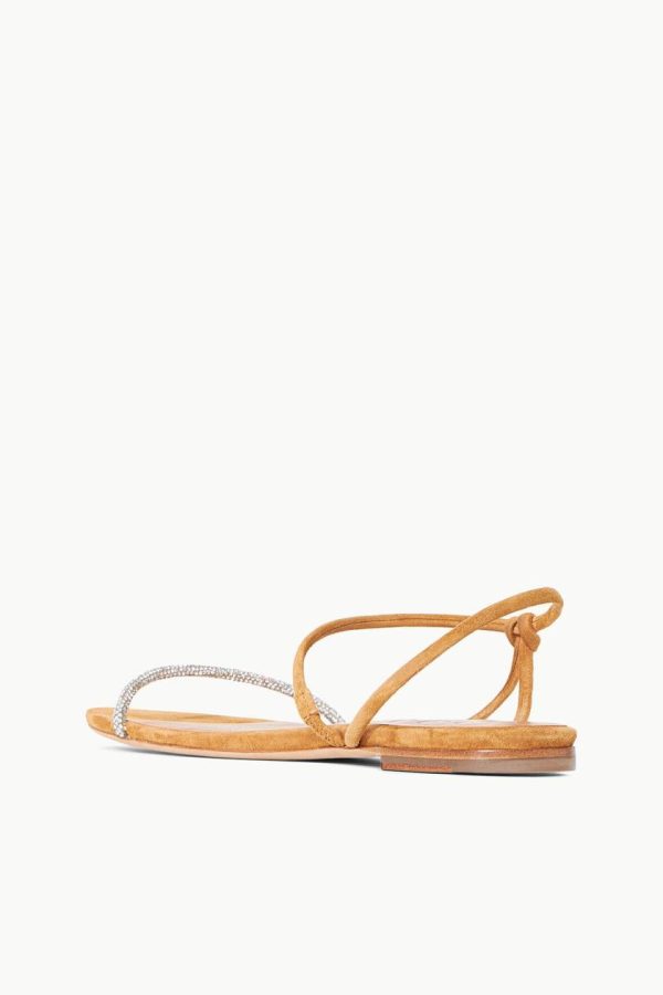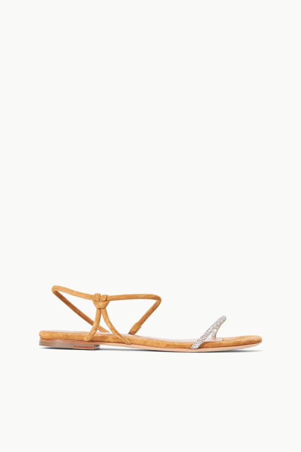 A flat sandal with tubular straps, the Laurel Sandal features a crystal cord toe strap and suede ankle strap.