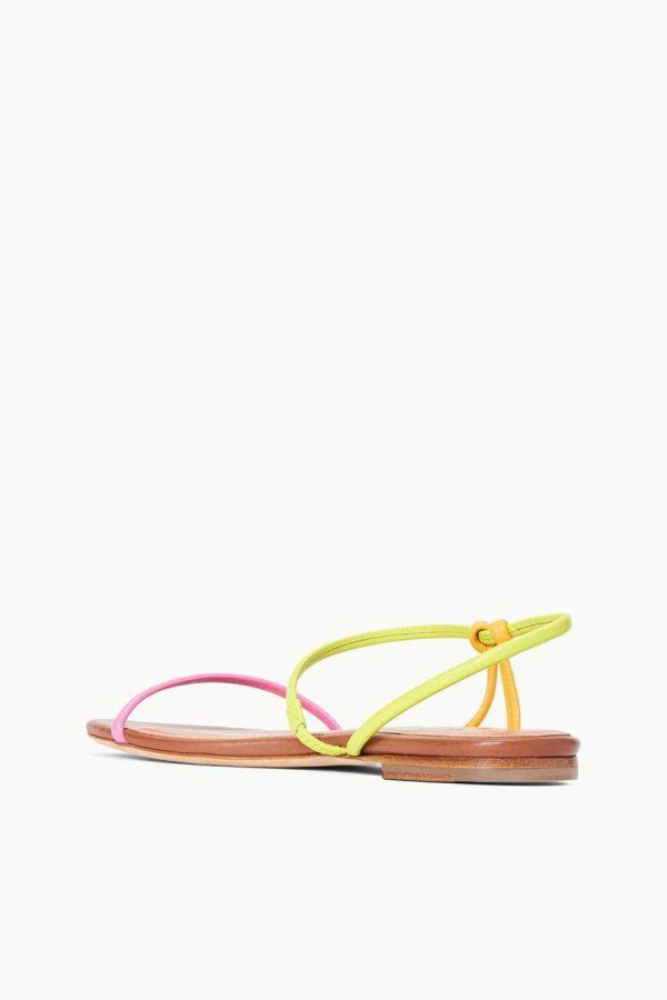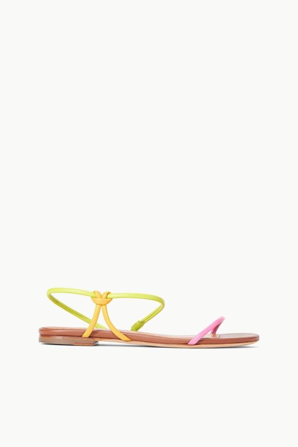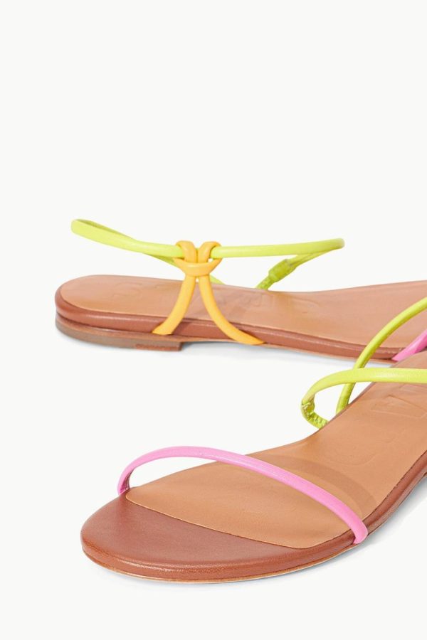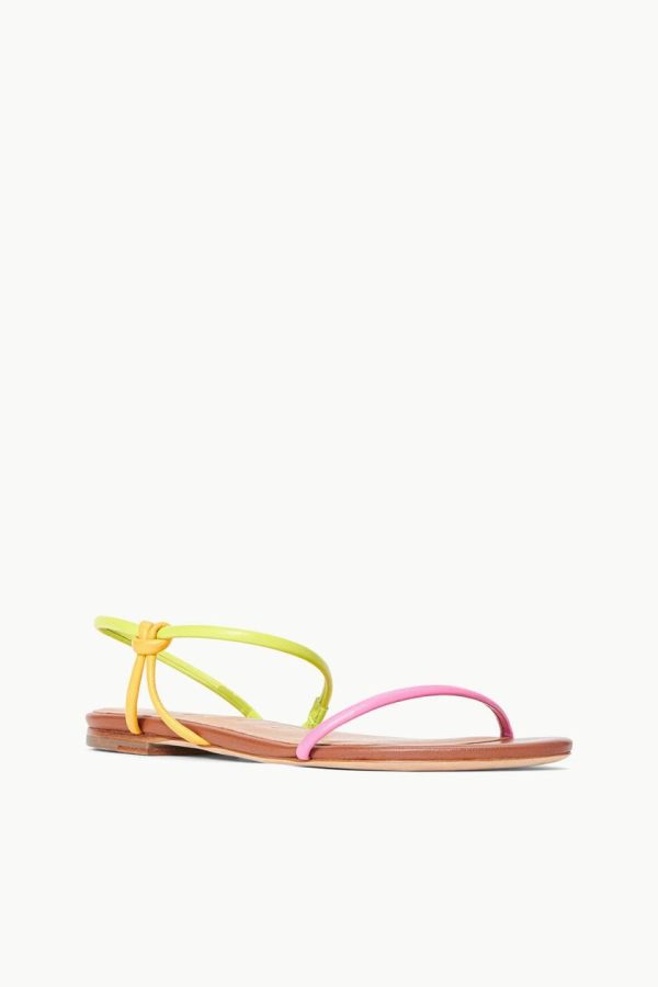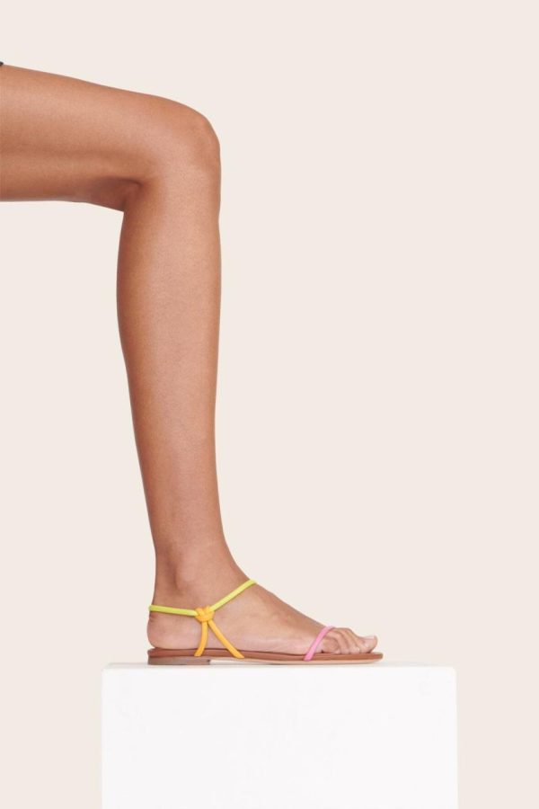 A flat sandal with multi-colored tubular straps, the Laurel Sandal features a leather cord toe and ankle strap.