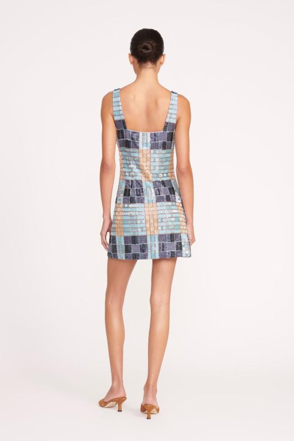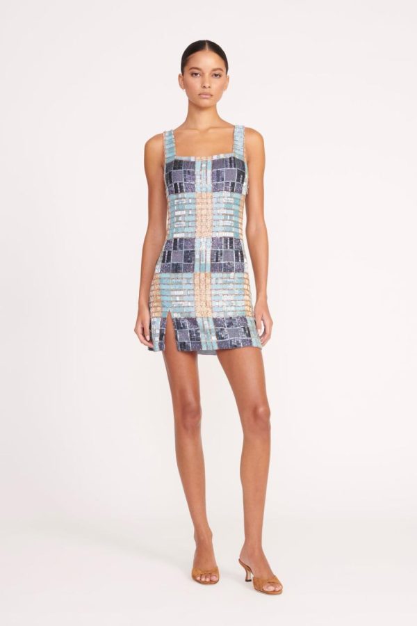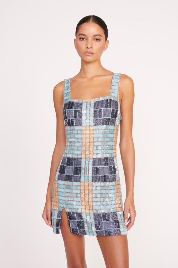 A slightly stretchy, fully hand-beaded mini dress, the Le Sable features an all over plaid pattern and right leg slit.