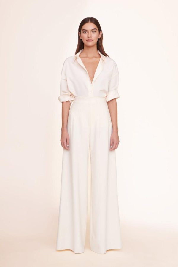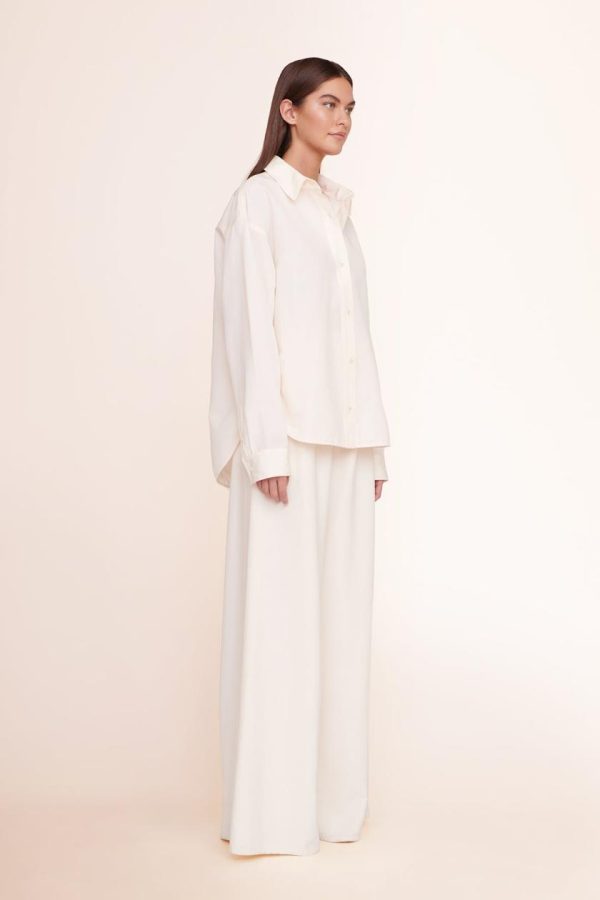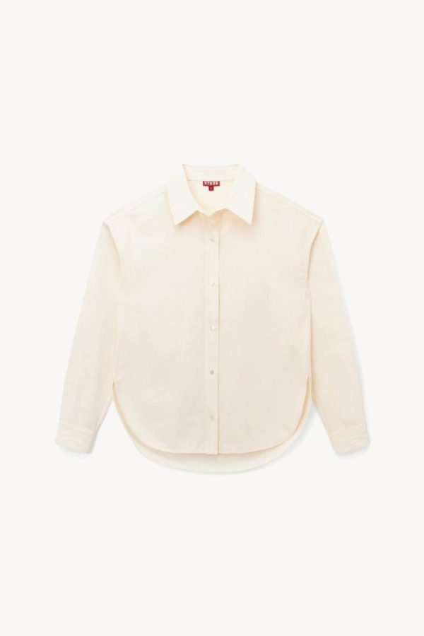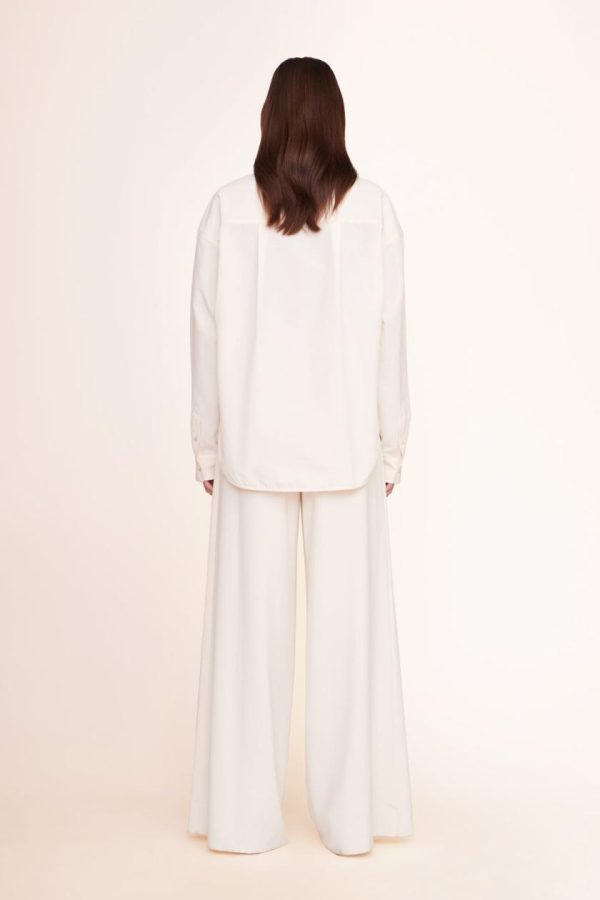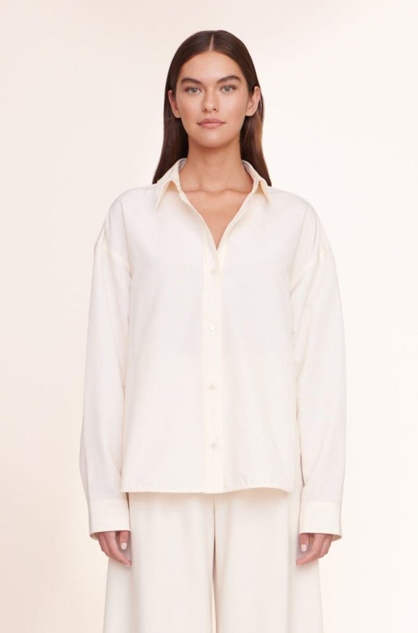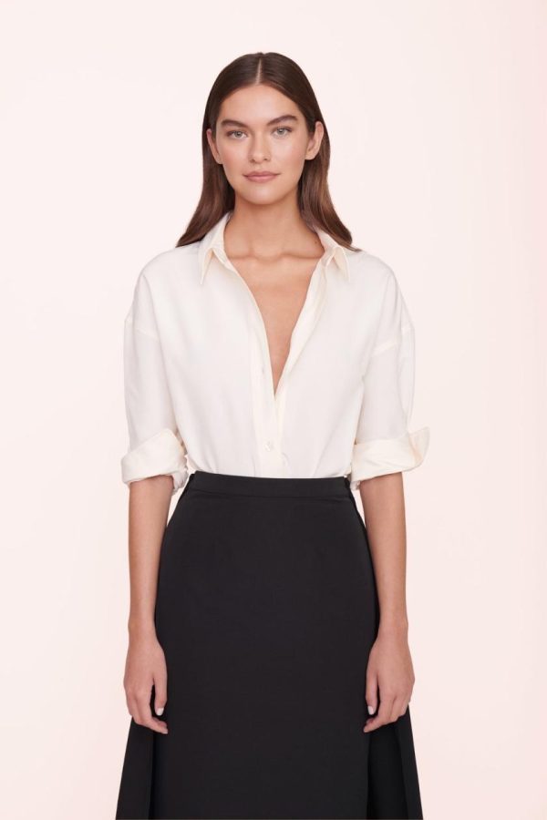 The Leonora Top is an oversized grosgrain button down shirt with a high low short tail hem.