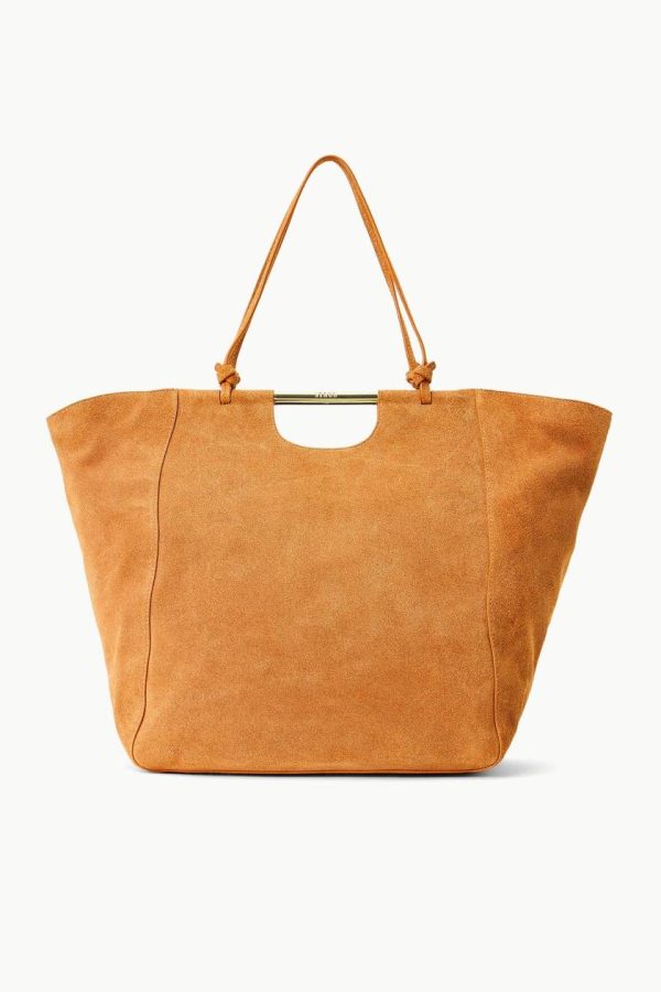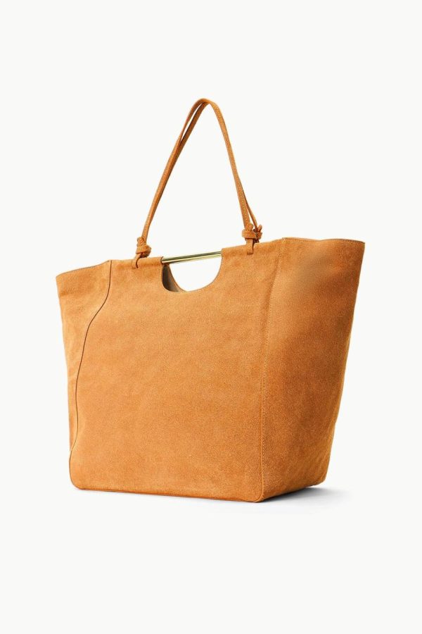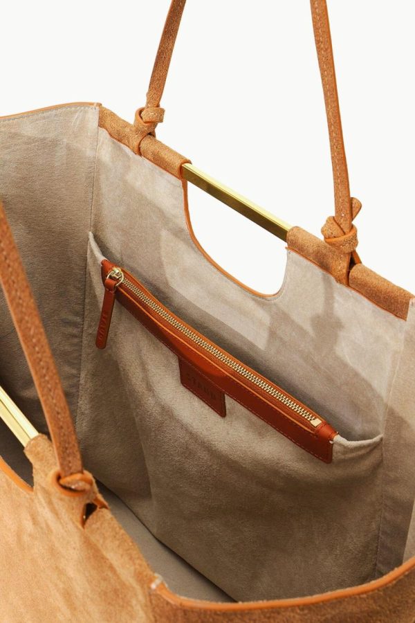 A large open tote with metal handles. The Mar is lightweight enough to hand-carry while featuring concealable thin straps for an over-the-shoulder option. This style features an interior zip bag.