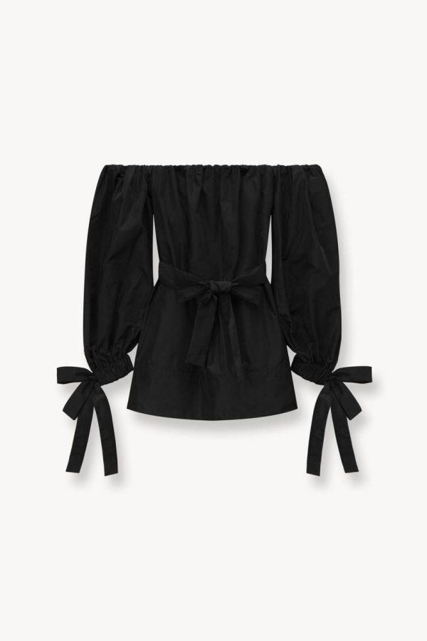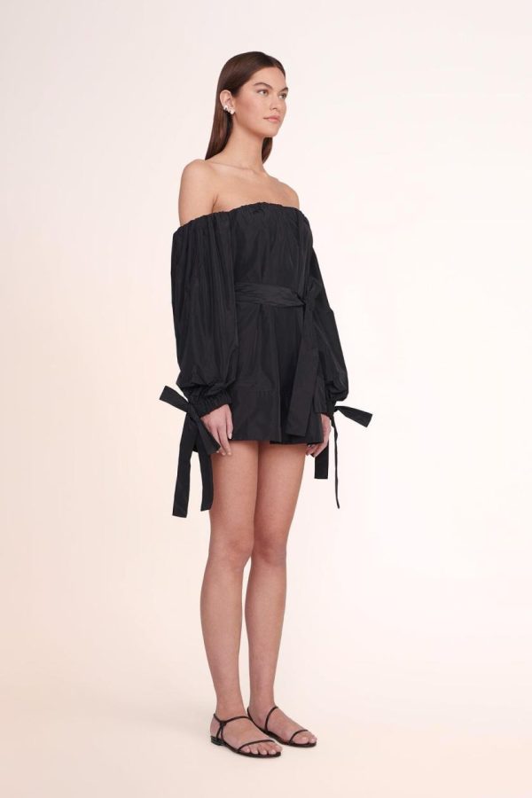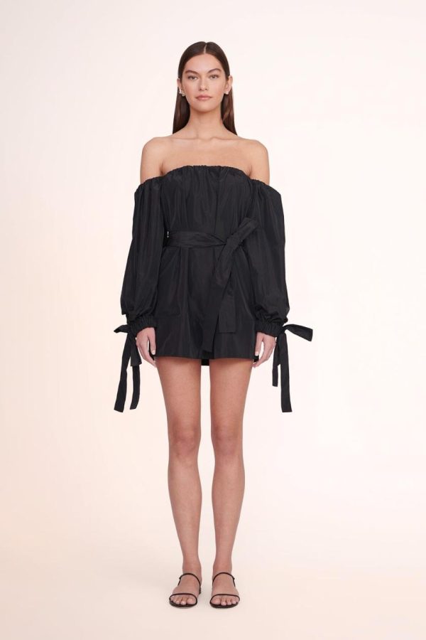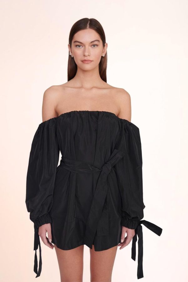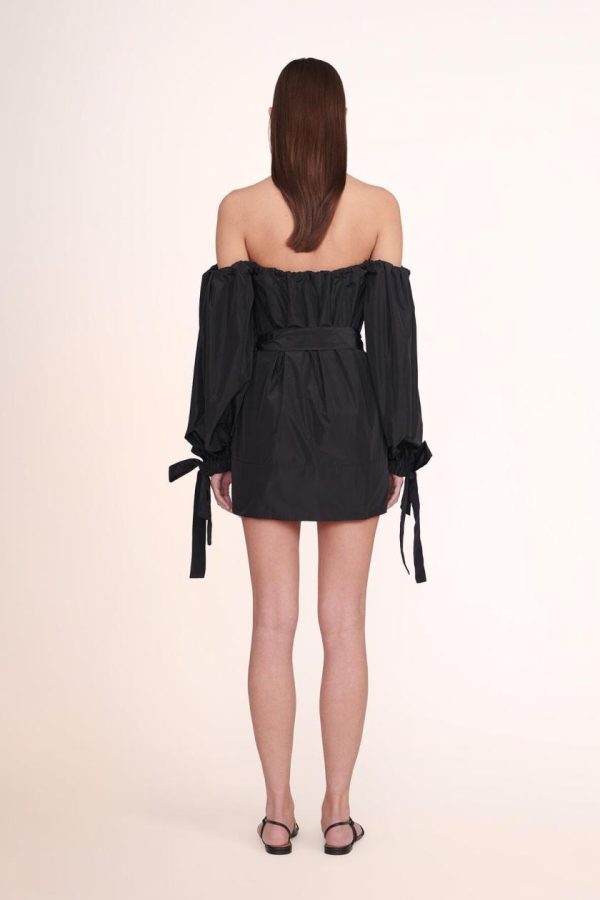 The Mini Colby dress is a taffeta mini tent dress. This style features off-the-shoulder sleeves, adjustable waist tie and tie details at the sleeve cuffs.