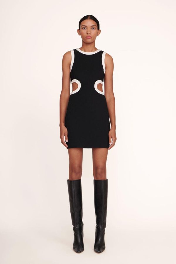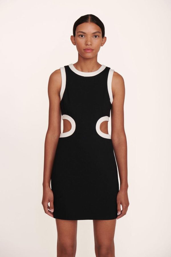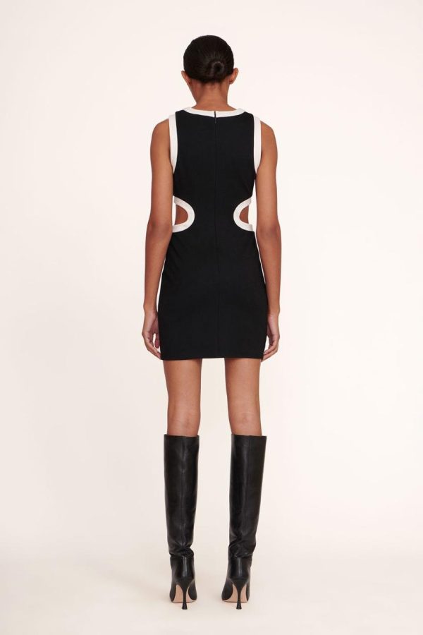 A mini-length, sleeveless ponte dress with waist cutouts and contrast trim.
